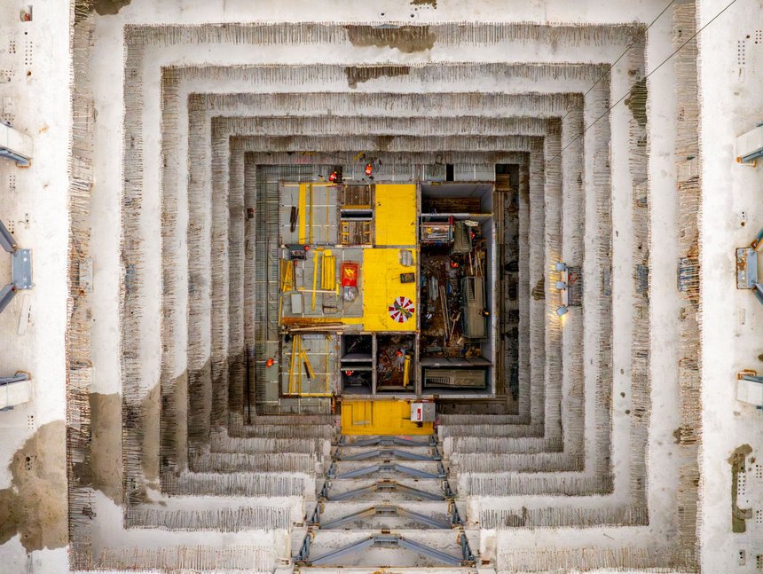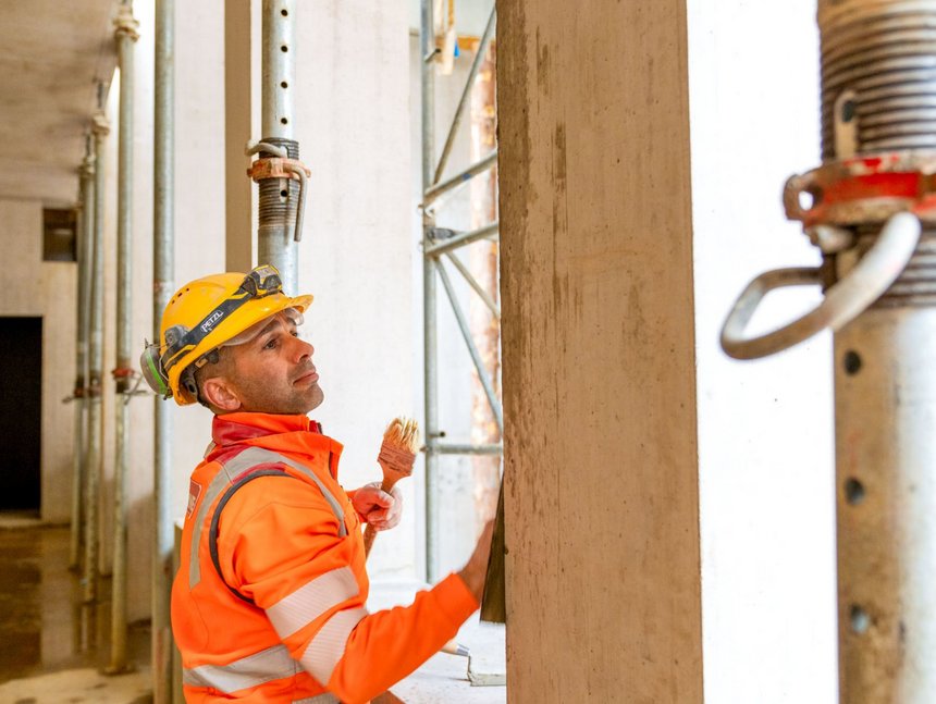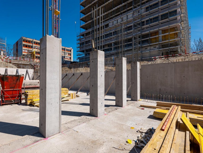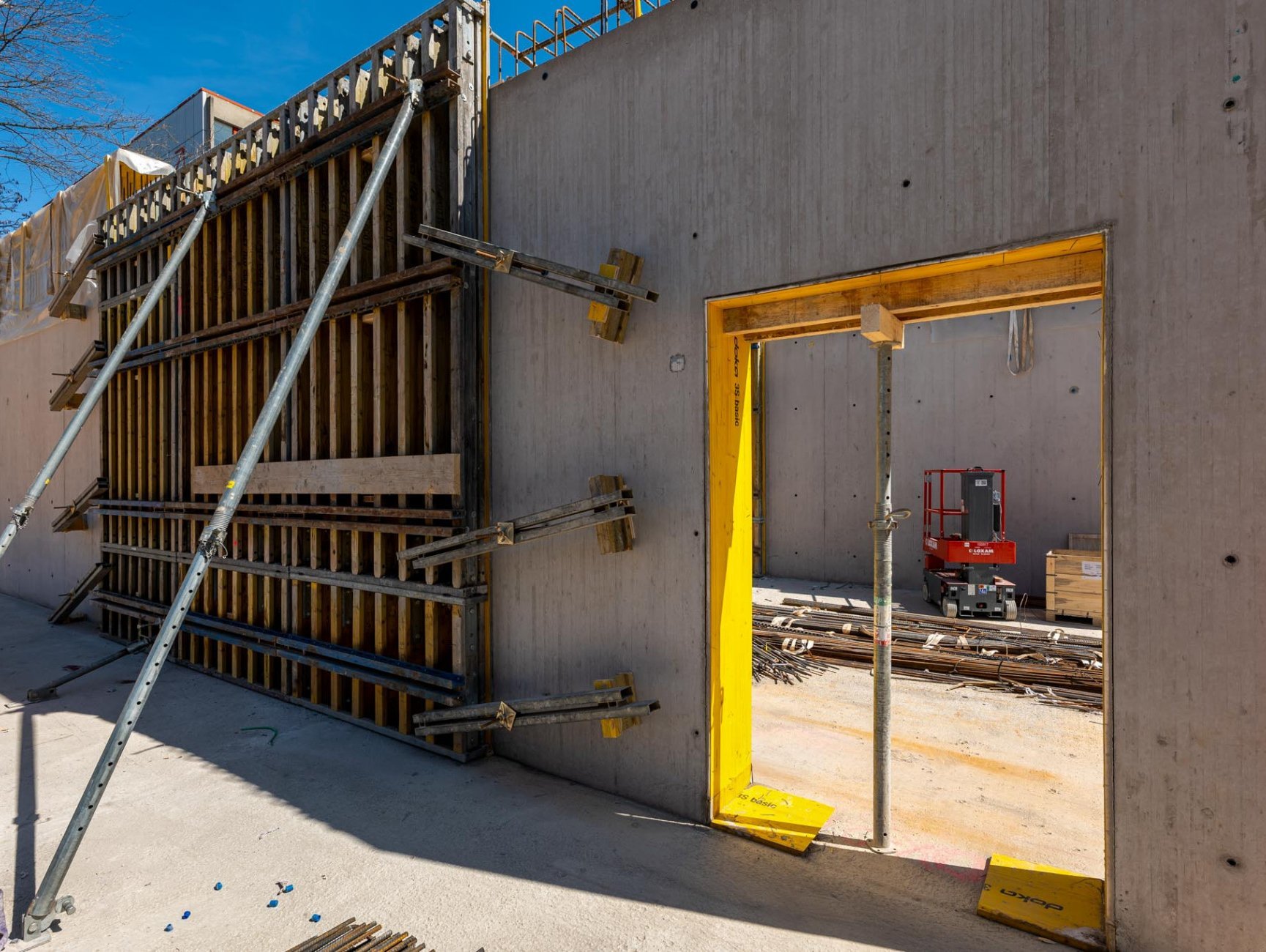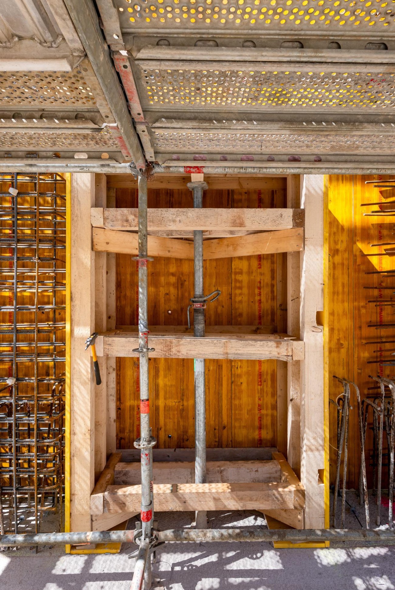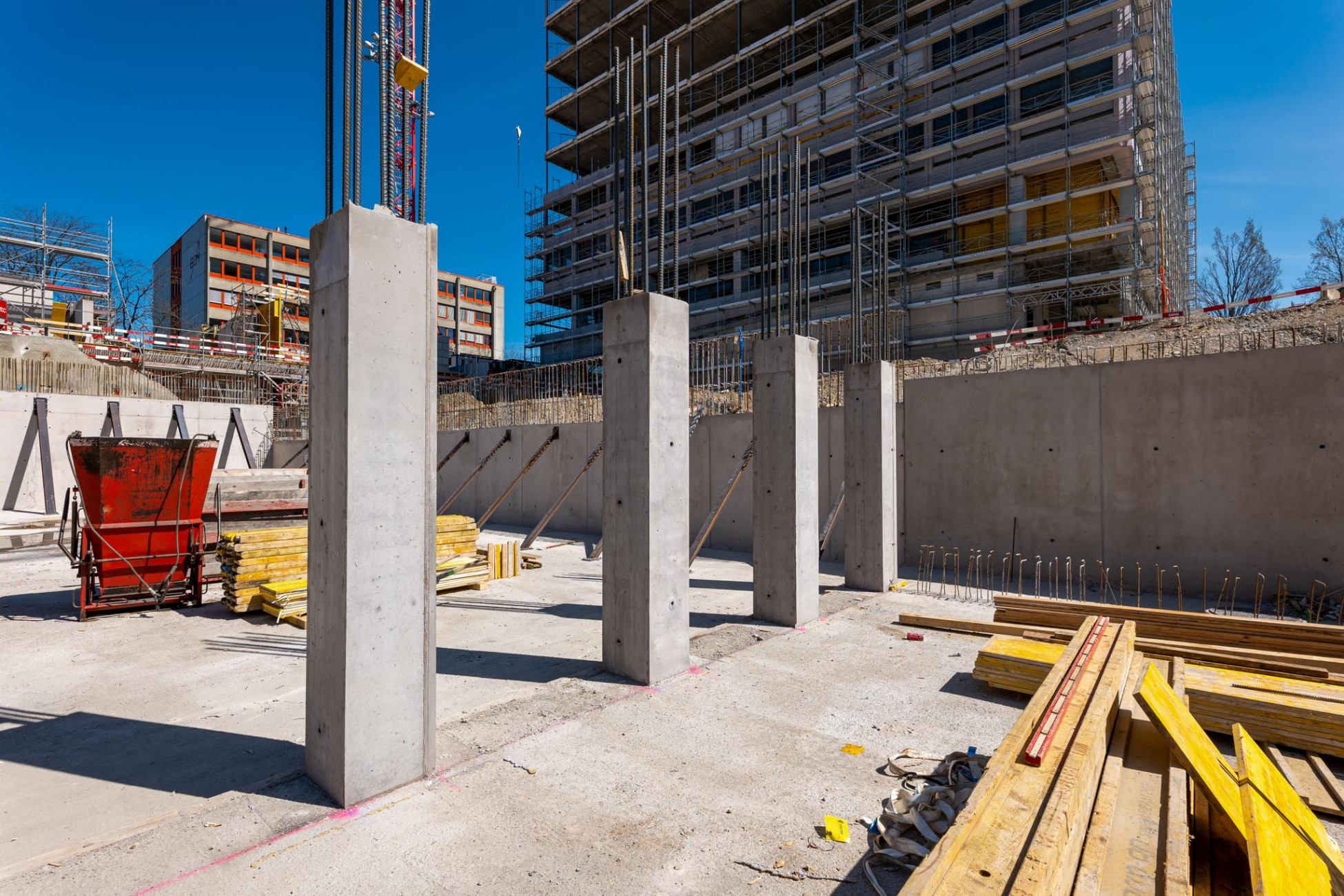 Das zuvor entkernte Turmgebäude erhält während der Neubauphase einen neuen Gebäudekern. Bestehende Gebäudeteile werden über umlaufende Schwindgassen mit dem neuen Kern verbunden. Die Wände, Decken, Nottreppen sowie die zentrale Haupttreppe werden geschossweise in hochwertigem Sichtbeton ausgeführt. Die Wand- und Deckenarbeiten erfolgen dabei parallel: Sobald in der einen Hälfte eines Geschosses die ersten Wände betoniert sind, wird dort bereits mit der Decke begonnen - während zeitgleich in der zweiten Hälfte die Wände entstehen. Nach Abschluss aller Geschosse und Fertigstellung des Kerns werden die Schwindgassen geschlossen und die temporäre Spriessung entfernt.