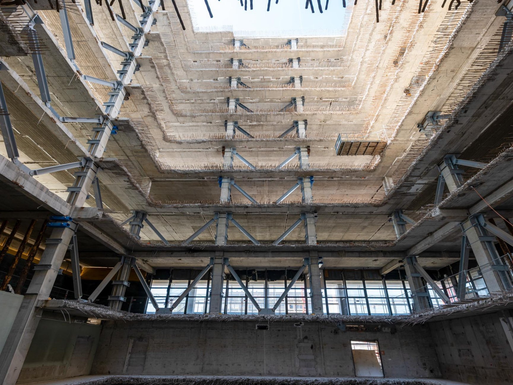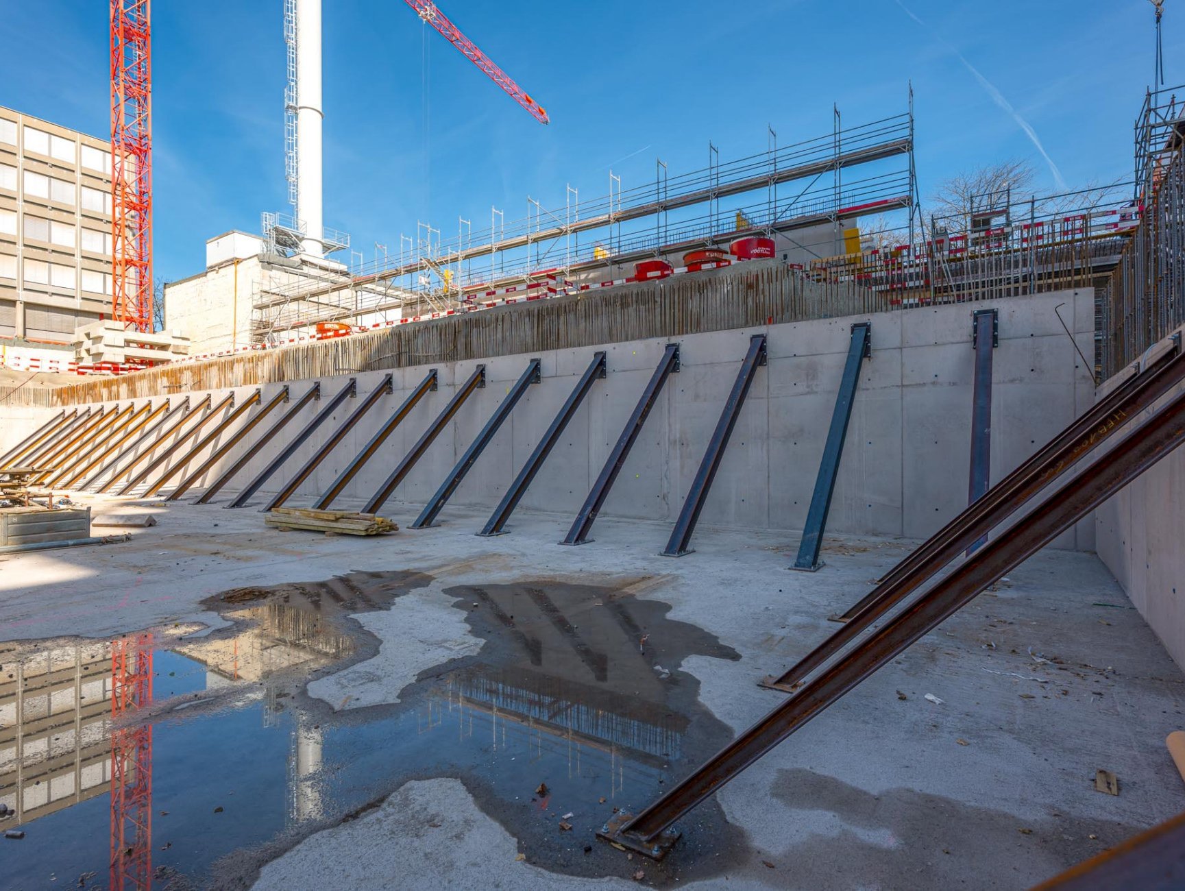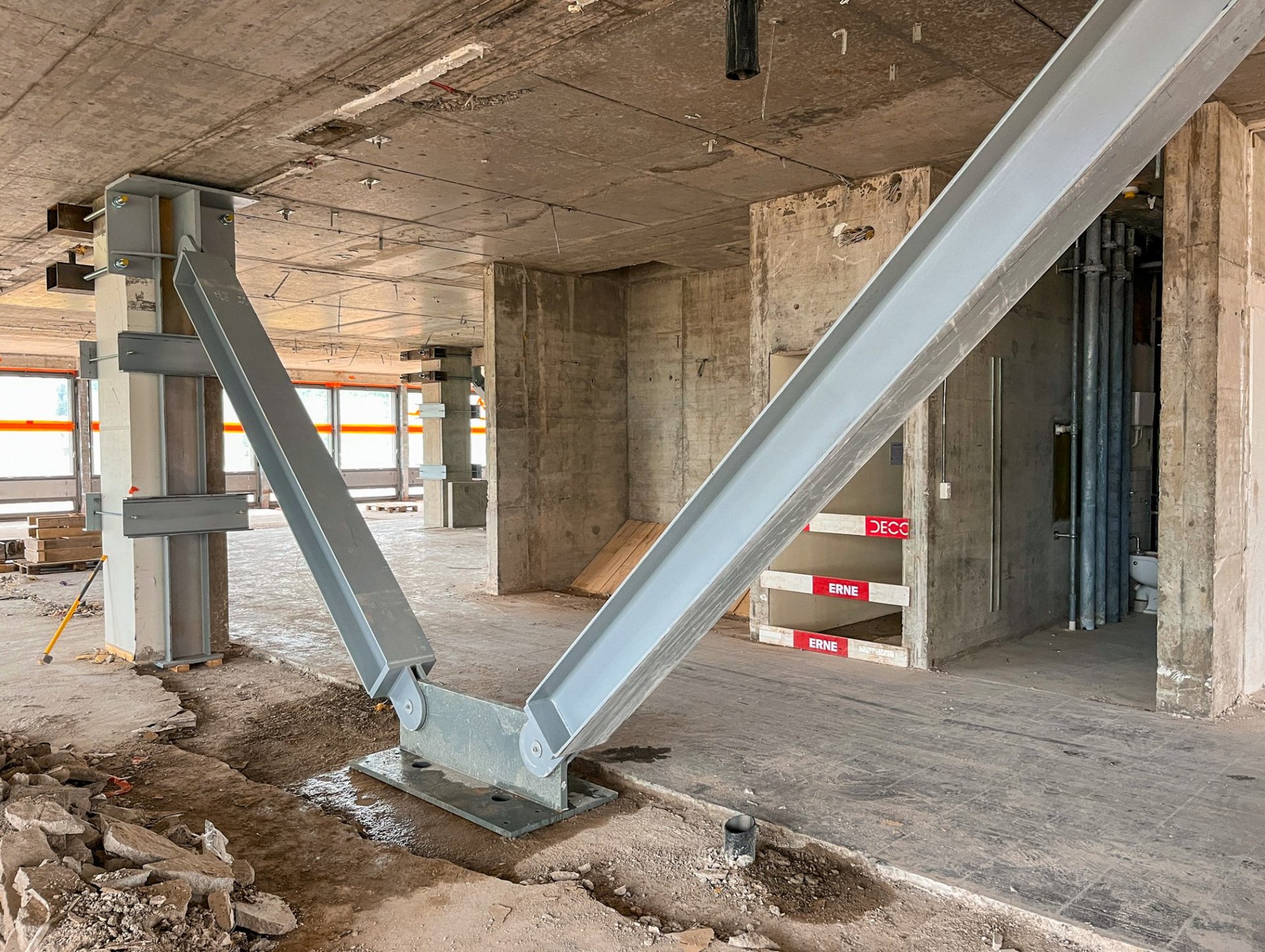 Für die notwendige Aussteifung während der Bauphase wurden zusätzliche Verstärkungsmassnahmen im Inneren des Gebäudes umgesetzt. Auf jeder Geschossebene benötigte es dazu jeweils vier Stahlrahmenkonstruktionen mit Queraussteifungen, mit einem Einzelgewicht von ca. drei Tonnen, zur sicheren Lastabtragung. Diese temporäre Konstruktion wird nach Abschluss der Um- und Neubauarbeiten wieder vollständig zurückgebaut.