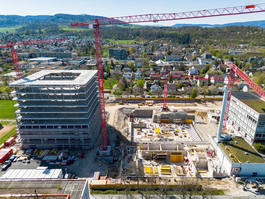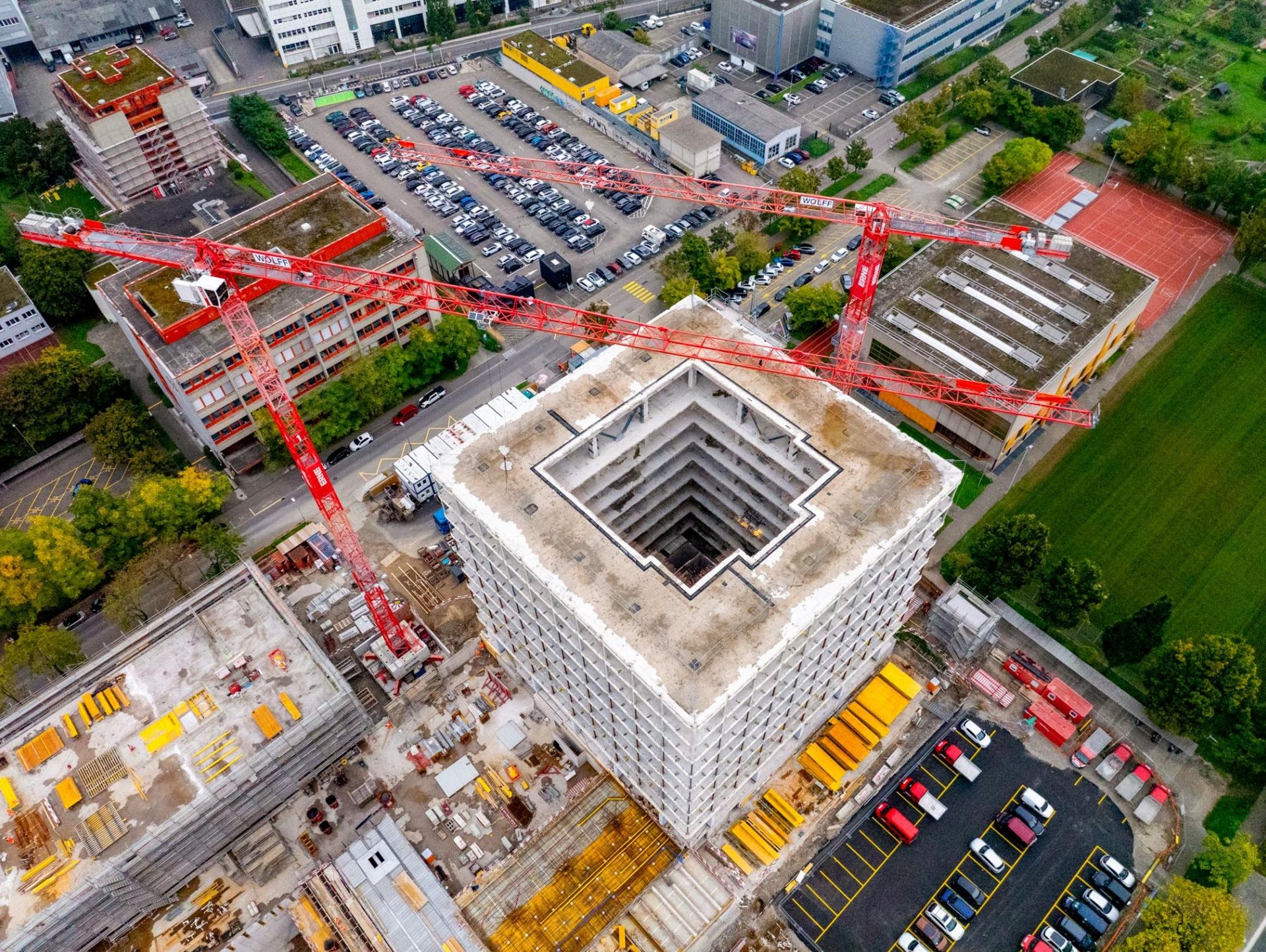 Im Rahmen der Grundstückvorbereitung wurden bestehende Gebäude in Zusammenarbeit mit Aregger AG Bauunternehmung abgebrochen. Besonders anspruchsvoll war die Sanierung und Entkernung des Turmes, welche von oben nach unten durch ERNE decon ausgeführt wurde. Parallel dazu erfolgte die Schadstoffsanierung. Anschliessend starteten die Abbrucharbeiten. Auf einer Fläche von 20x20 Metern wurde die Kernzone des 12-geschossigen Bauwerks – inklusive Kernwände, Treppenanlagen, bis hin zur Bodenplatte und den vorhandenen Fundamenten – vollständig zurückgebaut.