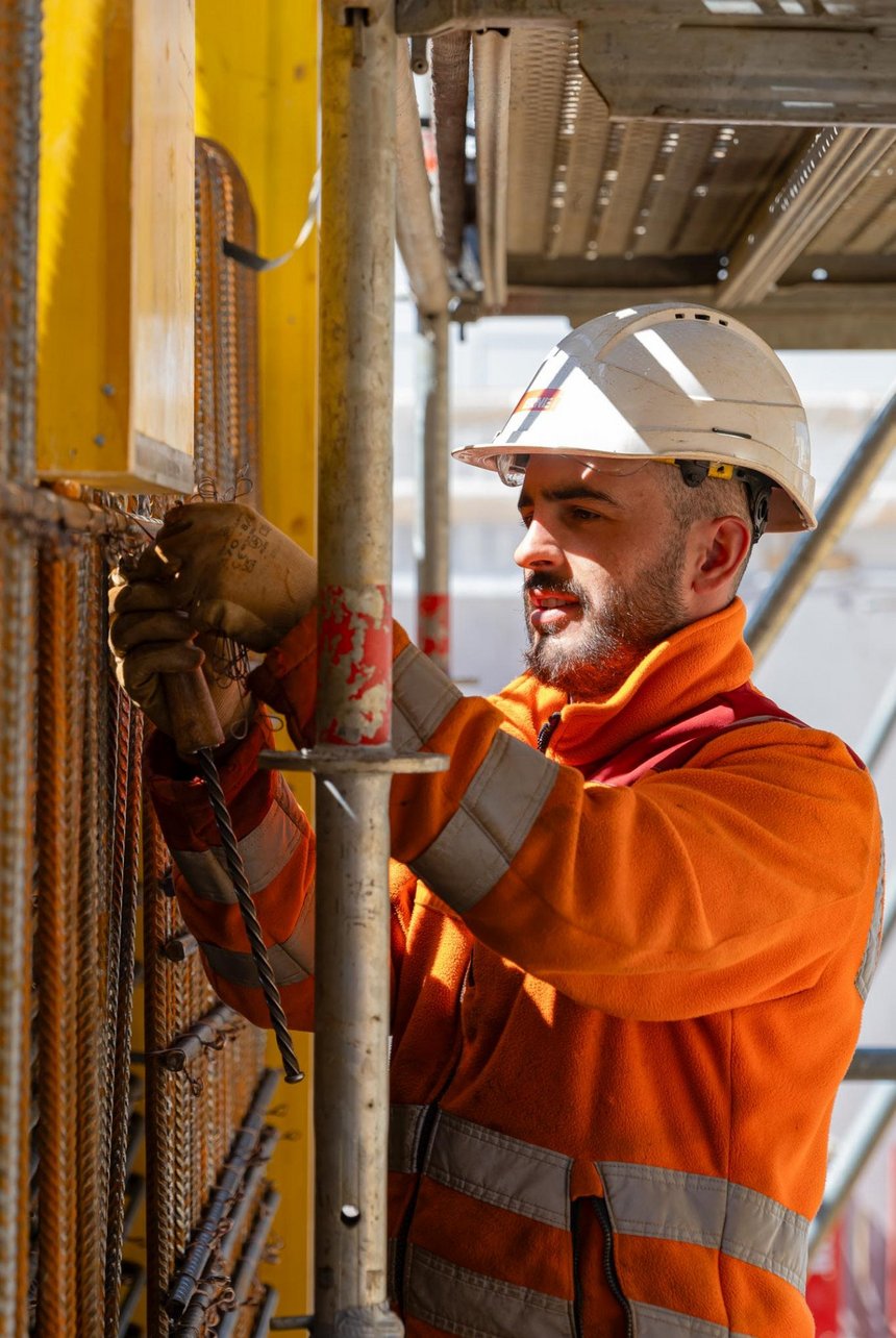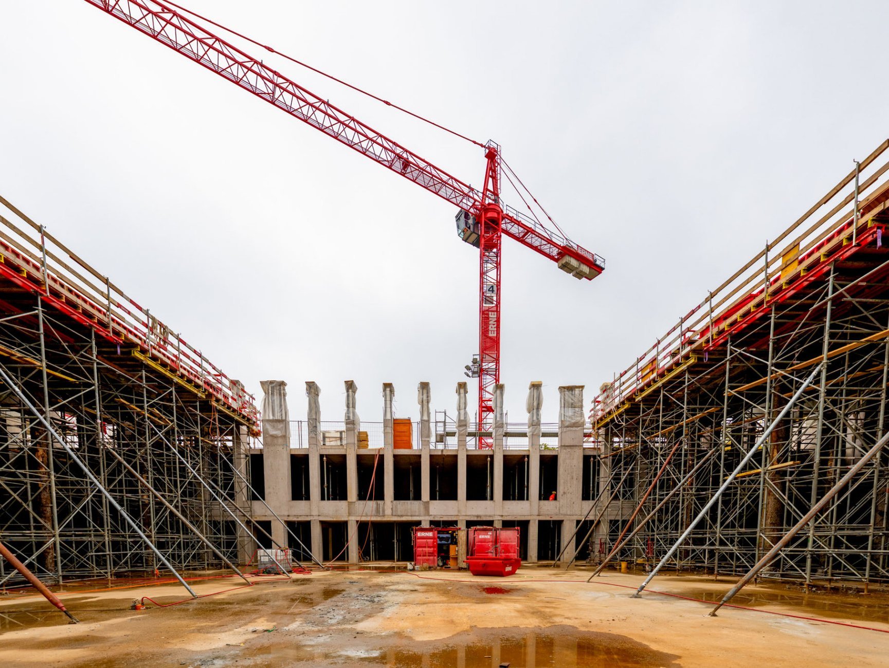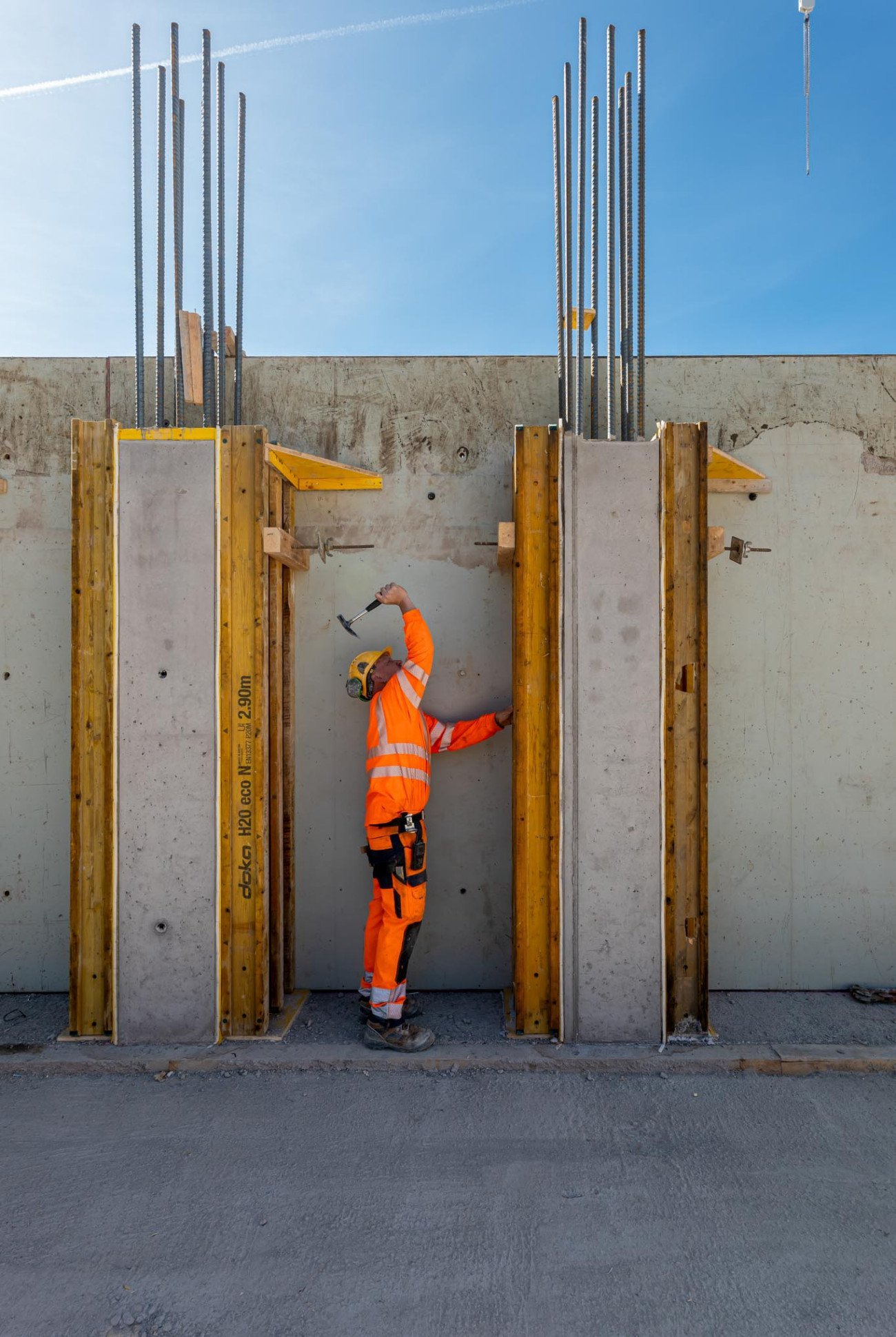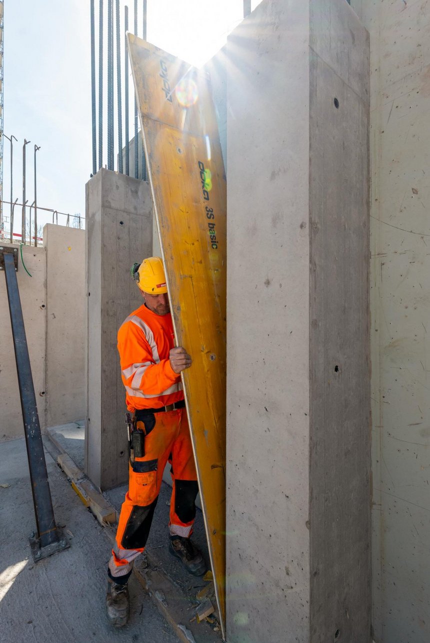 Das neue 55 Meter lange und 26 Meter breite Werkstattgebäude wird in einer dreiteiligen Etappierung errichtet. Das Etappierungskonzept erlaubt eine simultane Bearbeitung von Wänden, Stützen, Erdbebenwänden und Decken pro Geschoss – ein effizienter Baubetrieb, der Präzision und Geschwindigkeit vereint.