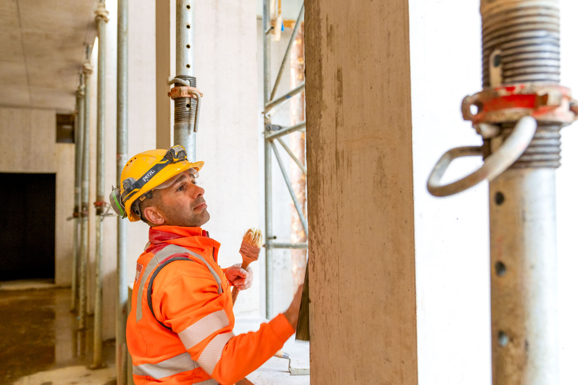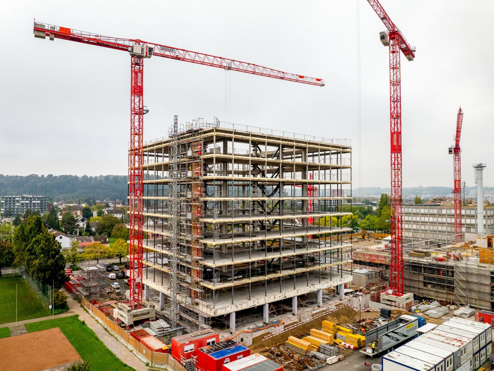 Alle Gebäude der Etappe 1 – BBZ werden in hochwertigem Sichtbeton ausgeführt. Für eine glatte, gleichmässige und durchgehend einheitliche Betonoberfläche kommt ein spezielles Sichtbetonkonzept zum Einsatz. Durch eine präzise Ausführung und exakt gleich grosse Betonieretappen entsteht ein harmonisches und gleichmässiges Erscheinungsbild. Die hierfür benötigten Spezialschalungen fertigt unsere Schwesterfirma HUSNER AG Holzbau projektbezogen an.