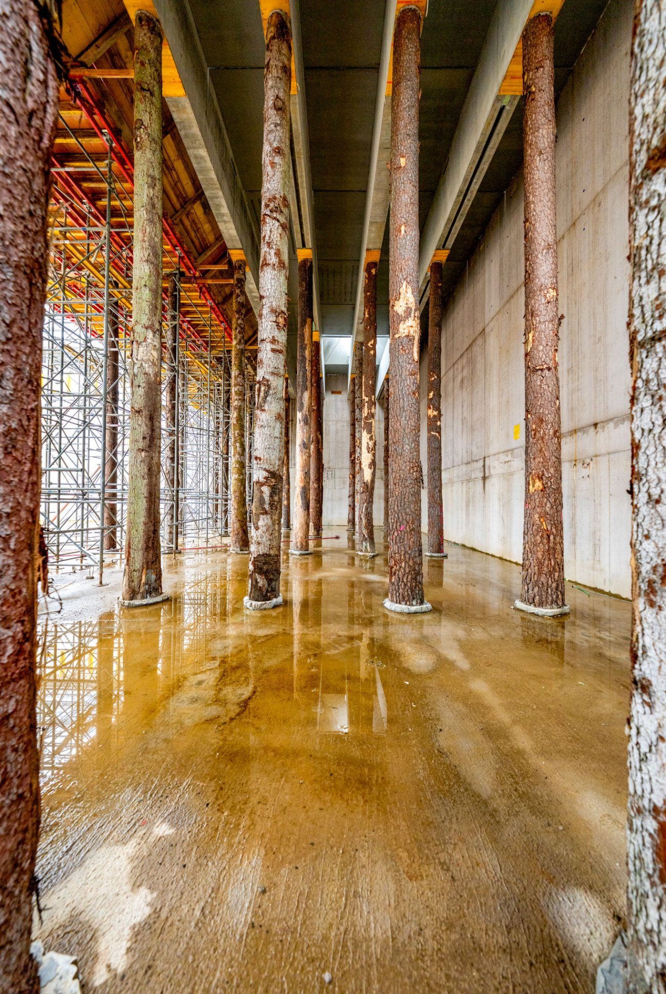 Der Bau der Träger erfolgt abschnittsweise: Das Hochbau-Team erstellt jeweils gleichzeitig zwei Träger auf der linken und zwei auf der rechten Seite. Nach Fertigstellung aller Träger wird die Decke betoniert und provisorisch mit Baumstämmen abgestützt. Anschliessend werden die Spannbetonträger vorgespannt, wodurch die gesamte Konstruktion ihre endgültige Stabilität erhält.