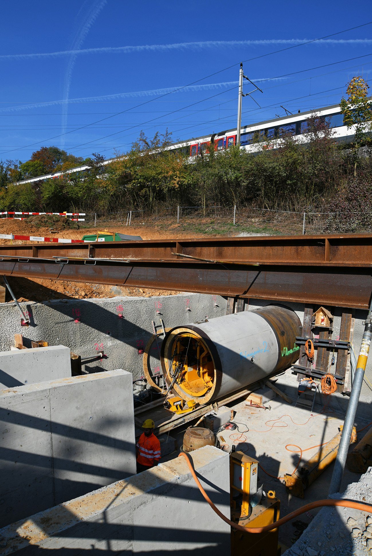 Für die Verbindung der beiden Übergangsbauwerke mit den Erdkabeln musste im Bereich des Bauwerks Süd die SBB Bahnlinie unterquert werden, der Zugverkehr durfte dabei nicht beeinträchtigt werden. Eine Herausforderung die die Tiefbau-Spezialisten mit dem sogenannten «MicrotunnelingVerfahren» perfekt meisterten. Durch die grabenlose Verlegung der Rohre wurde unter der Bahnlinie ein großer Tunnel mit 2,4 Meter Durchmesser erstellt. Aufgrund von Felsvorkommen in Einzelabschnitten der Tunnellänge kamen die Tiefbauer teilweise nur 30 Zentimeter pro Tag vorwärts. Nicht nur im Bereich der SBB-Bahnlinie stiess das Team auf felsiges Gebiet, auch in der Nähe des Bauwerks Nord musste mit der Felsfräse Material abgetragen werden. Das milde und trockene Wetter im Herbst 2018 begünstigte die Tiefbauarbeiten. Die Oberböden mit den Vegetationsschichten A und B konnten an einigen Stellen schon im Spätherbst abgetragen und sorgfältig separat deponiert werden. Dies war wichtig, um die längere Regenperiode im Januar ohne Arbeitsunterbruch zu meistern: Durchnässte Oberböden dürfen bei schlechtem Wetter nicht befahren werden. So konnte auch im neuen Jahr gemäss dem Bauprogramm weitergearbeitet werden.