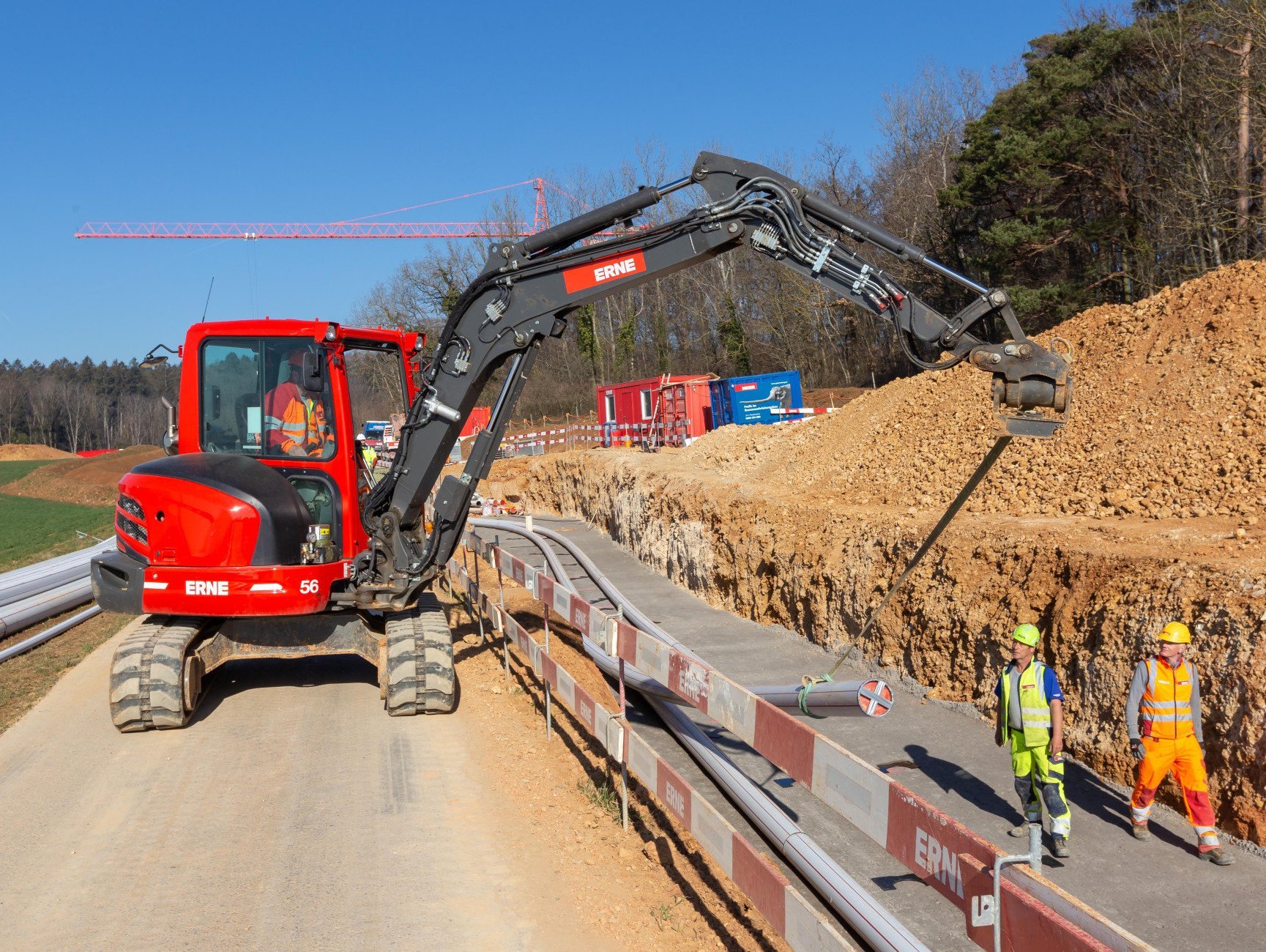 Um die 1,5 Meter breiten Rohrblöcke effizient verlegen zu können, wurden vorgängig ausserhalb des Grabens Rohrstränge erstellt, die aus muffengeschweissten Polyethylenrohren bestehen. Alle Monteure vor Ort verfügten über eine Schweisszertifizierung und rapportierten jede einzelne Schweissnaht genau, um die Qualität sicherzustellen. Die vorgegebenen Abkühlzeiten mussten exakt eingehalten und die entstandene Innenwulst nach jedem Schweissvorgang gründlich entfernt werden. Dies stellte sicher, dass die Kabel, die später eingezogen wurden, leicht und ohne Schaden zu nehmen durch die Rohre gleiten konnten. Die so vorgefertigten Rohrstränge wurden anschliessend in mehreren Etappen im Graben zu den Kabelrohrblöcken zusammengeführt. Das ERNE Tiefbau-Team betonierte dann die beiden Rohrblöcke und bedeckte diese wieder mit den abgetragenen, seitlich deponierten Oberbodenschichten.