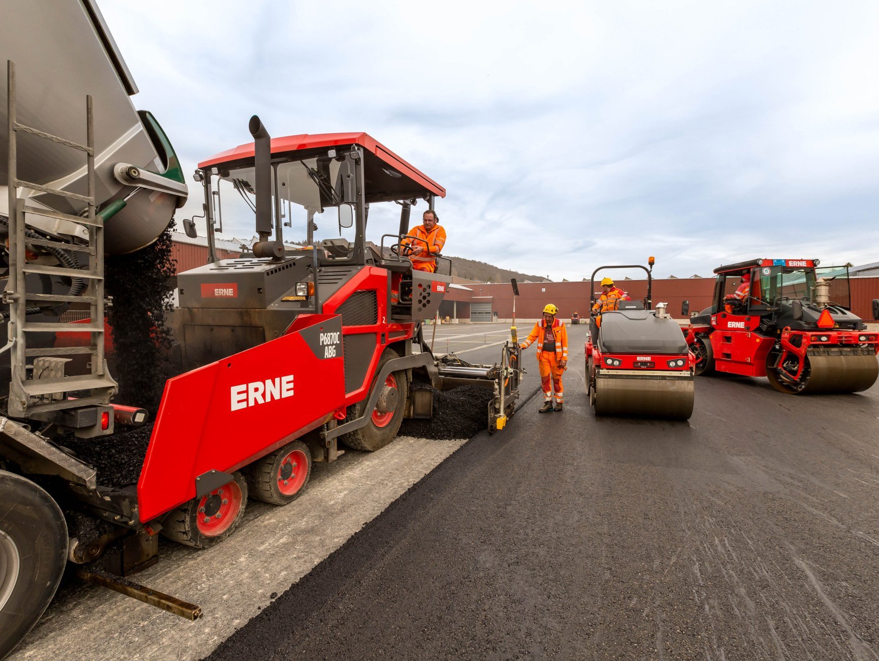 Auf der gesamten Fläche wurden danach 5’500 Tonnen Belag und 2’000 Quadratmeter Asphaltbewehrungen eingebaut. Stellenweise wurden bis fünfzig Zentimeter Belag verbaut, damit ein Gefälle entstand. Da an dieser Stelle zuvor ein Gebäude stand, verlief die Bodenplatte horizontal. Für den Platz war jedoch ein Gefälle nötig, damit sich das Wasser nicht in Pfützen sammelt, sondern seitlich in die Hydroblockrinnen abfliessen kann. Für den Einbau der Rinnen wurden durch die Spezialisten der Abteilung Bohren und Trennen Aussparungen in die bestehende Bodenplatte geschnitten. Bei den Arbeitsfugen der Betonplatten wurde eine Asphaltbewehrung verlegt, damit an diesen Stellen keine Rissbildung entstehen kann.