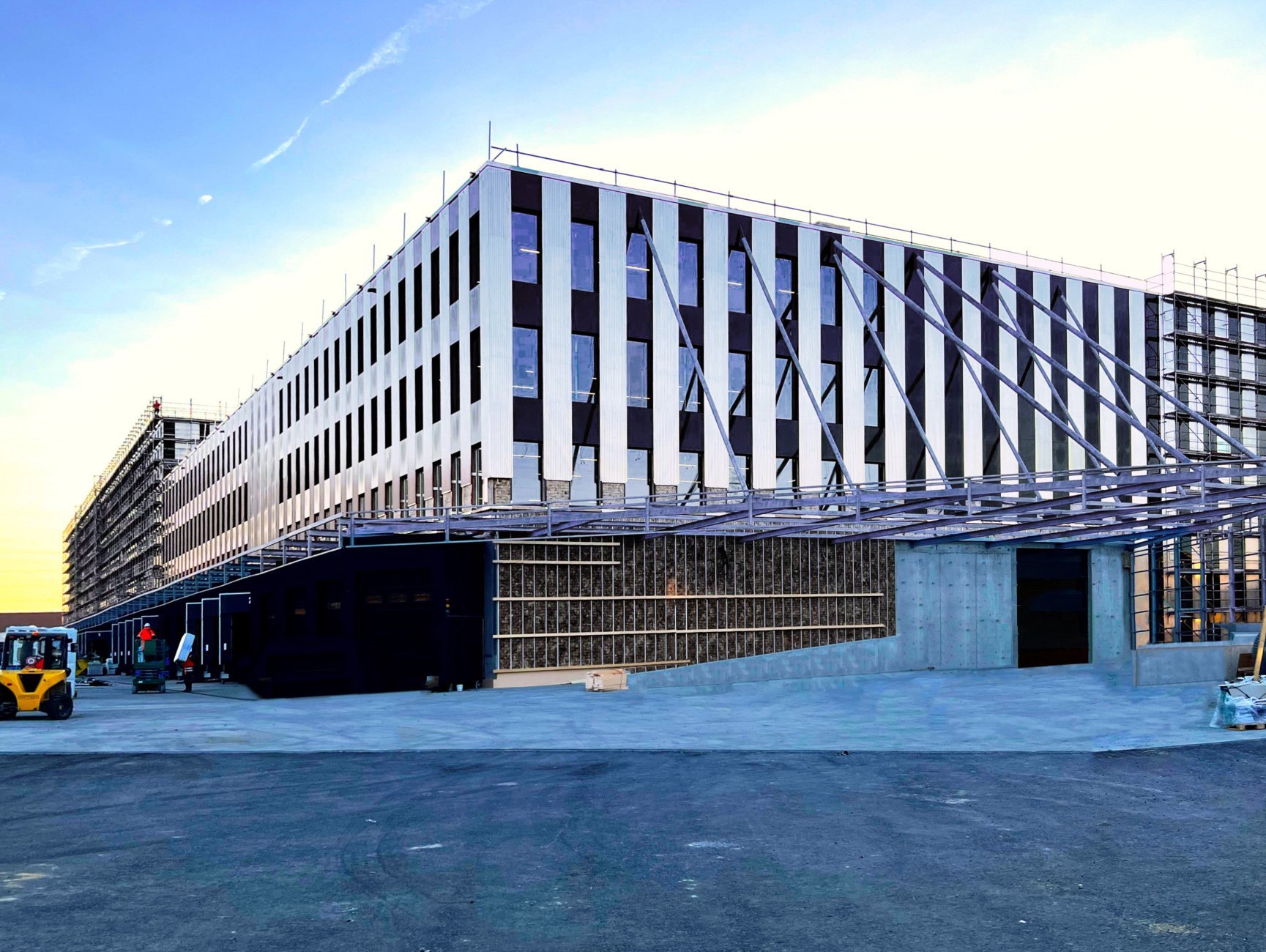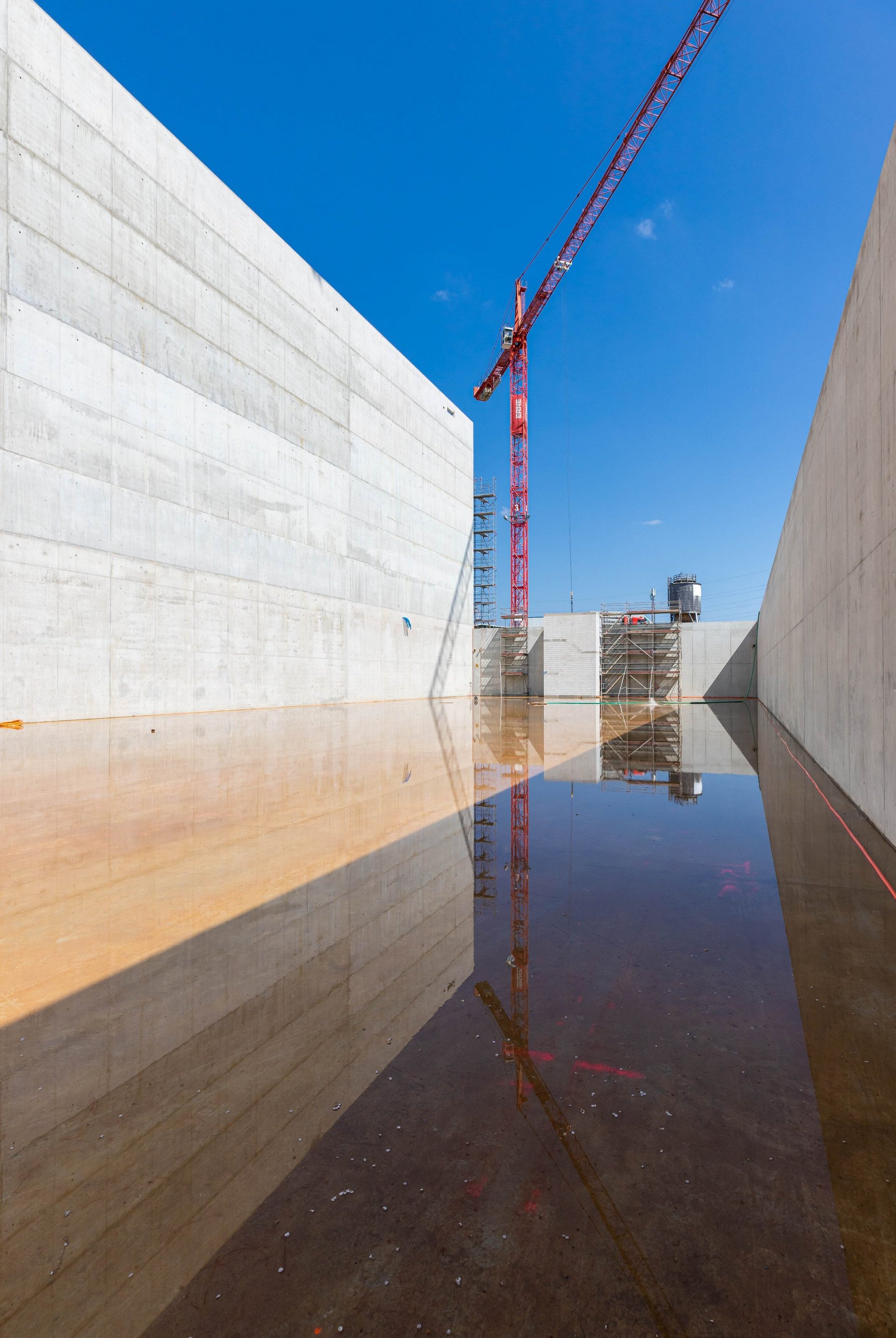 Beim Neubau wurden imposante Hochregallagerwände in Ortbeton erstellt. Die Betonwand verläuft 7.40 m tief im Erdreich, ragt ab Terrain 23 m in die Höhe und zieht sich auf eine Gesamtlänge von beachtlichen 143 m. Mit 4 Kletterschalungen pro Seite konnten ca. 22 m lange Etappen erstellt werden. Die Schalung erfolgte durch eine Wandschalung, die mit Hilfe von Kletter- und Nachlaufbühnen in einem Kranzug umgesetzt wurde. Die Kletterbühne wurde projektspezifisch geplant. Durch die optimierte Schalungshöhe konnte während der Ausführung eine ergonomische Arbeitshöhe gewährleistet werden. Zusätzlich wurde mit diesem Vorgehen die Arbeitssicherheit massiv erhöht. Schnelle und optimierte Prozesse unterstützten pro aktiv den Baufortschritt. Komplettiert wurde das Hochregallager mit einer knapp 8 m hohen Betonwand, die mit aufgestockten #MAXIMO MX 18 330 Elementen erstellt wurde.