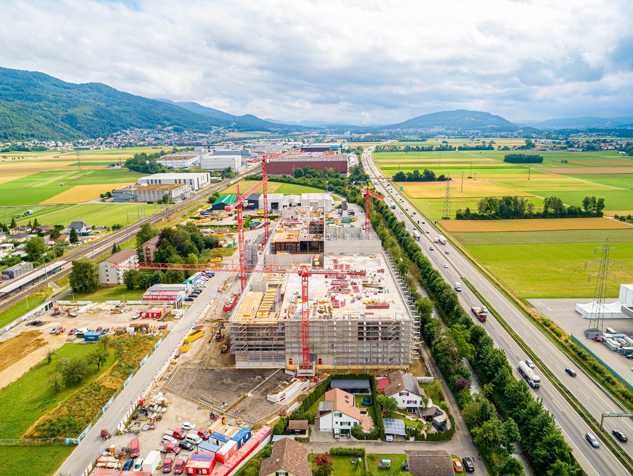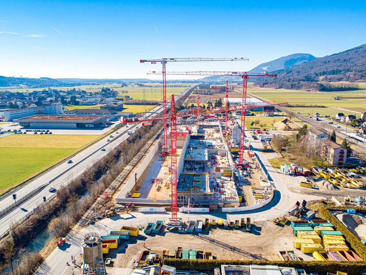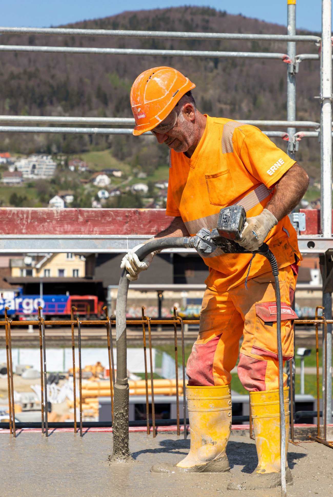 Damit die umfangreichen Betonier-Arbeiten (Bodenplatten, Betonwände, Geschossdecken) speditiv ausgeführt werden konnten, kam vor Ort unsere SBM-Betonanlage zum Einsatz. Fünf leistungsstarke Kräne mit einer Ausladung bis 75 m und 3.4 t Traglast an der Spitze managten die umfangreiche Baustellenlogistik.