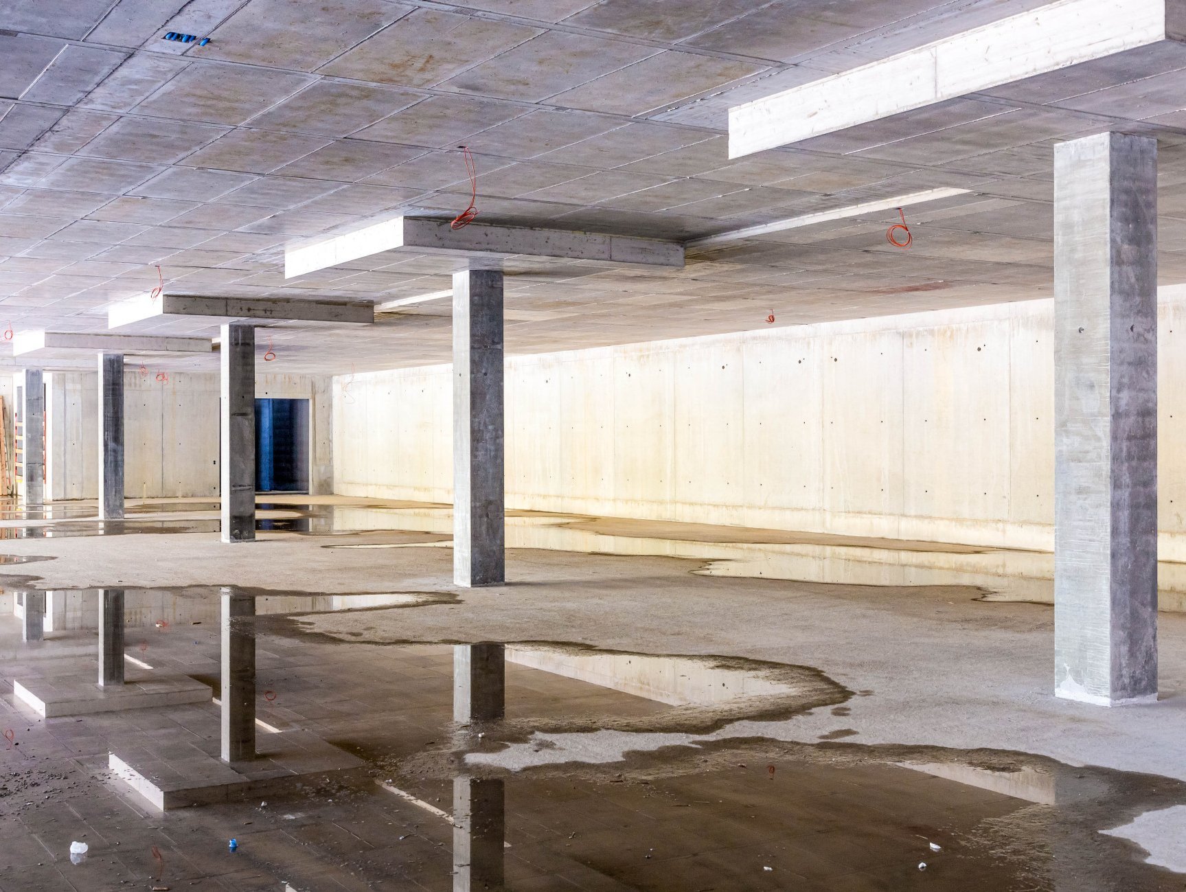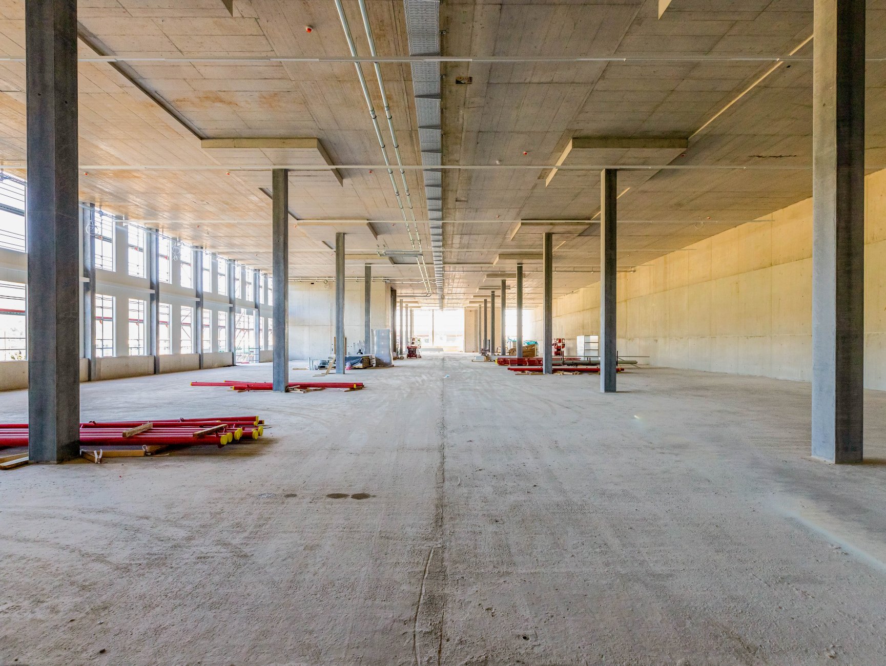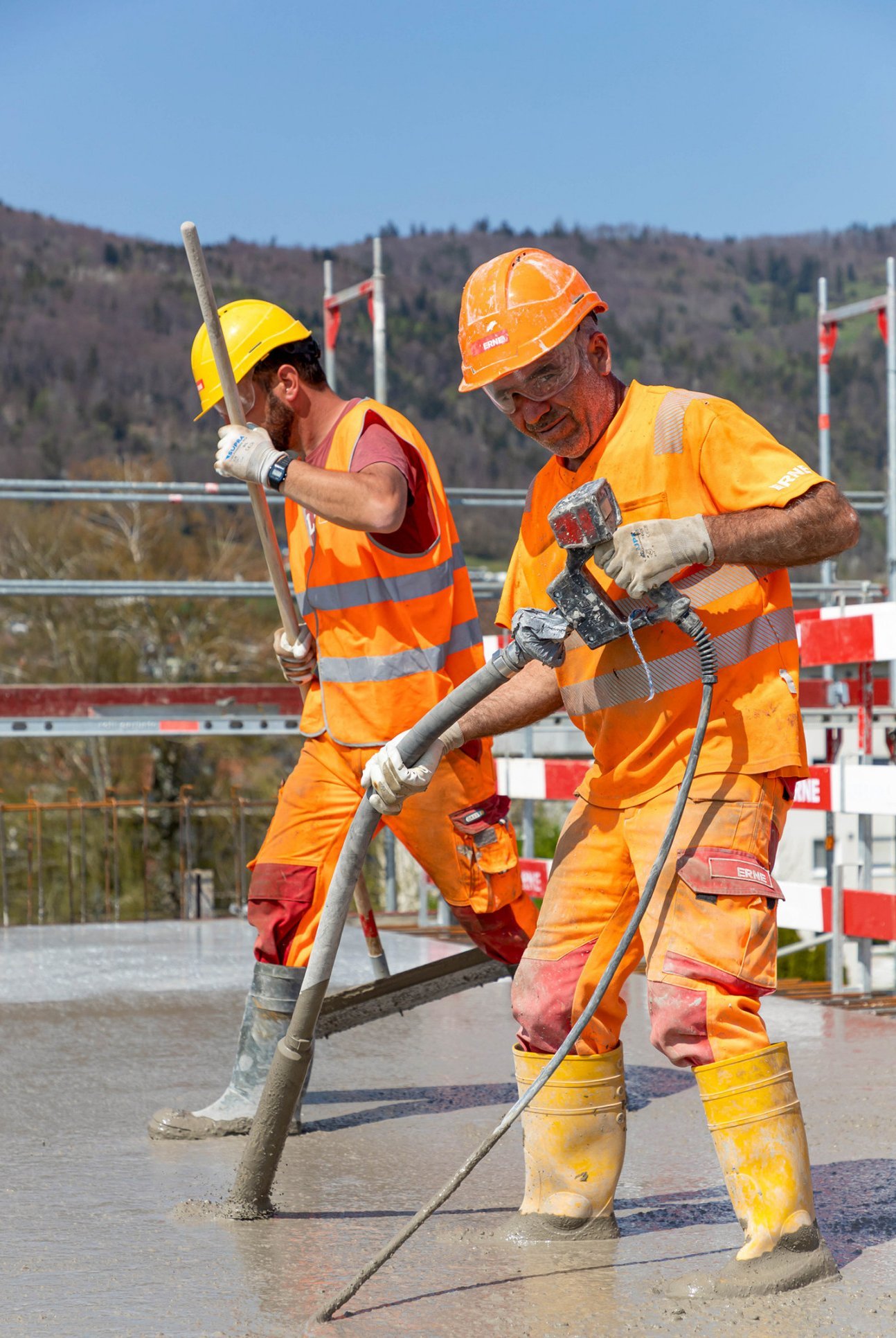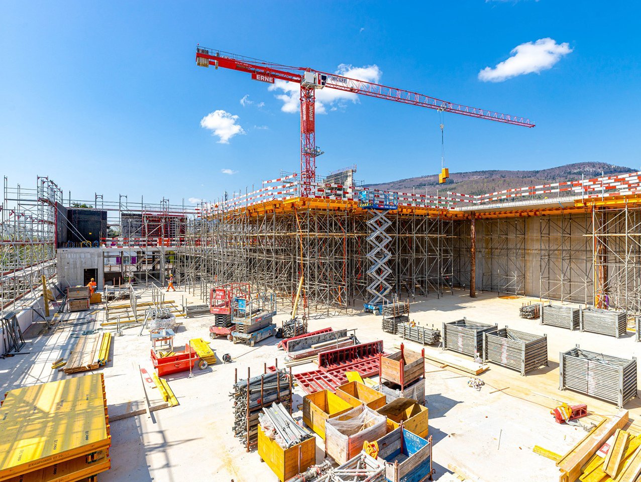 Damit die umfangreichen Betonier-Arbeiten (Bodenplatten, Betonwände, Geschossdecken) speditiv ausgeführt werden konnten, kam vor Ort unsere SBM-Betonanlage zum Einsatz. Fünf leistungsstarke Kräne mit einer Ausladung bis 75 m und 3.4 t Traglast an der Spitze managten die umfangreiche Baustellenlogistik.