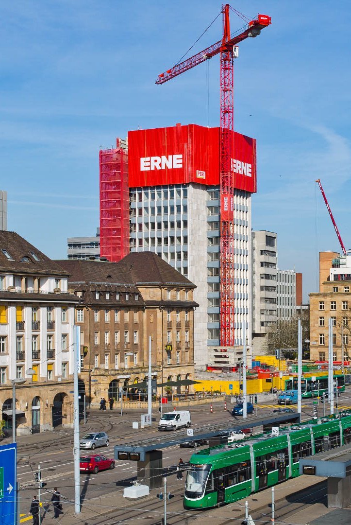 Durch die Lage am Badischen Bahnhof, mitten im Syngenta Firmengencampus mit Büro- und Laborgebäuden musste eine kreative Abbruchlösungen gefunden werden, um den Syngenta Tower still und leise zurückzubauen. Dank unserer top eingespielten Teams und einer guten Arbeitsvorbereitung wurde das sportliche Ziel, ein Regelgeschoss in 5 Arbeitstagen abzutragen, übertroffen. Die Spezialisten der ERNE decon führten im Vorfeld zeitgleich Arbeiten im Bereich Entkernung und Schadstoffsanierung aus. Insgesamt wurde getarnt, im ERNE Schutzschild, ein Abbruchmaterial von ca. 100 m3 Überzug, ca. 400 m3 Mauerwerk sowie ca. 100 m3 Beton unbewehrt und ca. 6500 m3 bewehrt abgebaut.