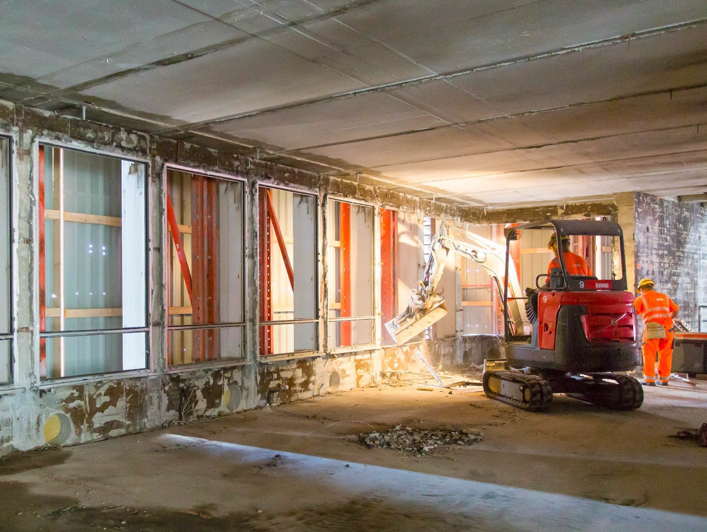 Nach einer eingehenden Untersuchung wurden Schadstoffe festgestellt; eine Spritzasbestsanierung war im Gebäude notwendig. Die Profis von ERNE decon übernahmen diese verantwortungsvolle Aufgabe der Dekontamination. Zwischenwände aus Gips und Backstein wurden aus dem Gebäude entfernt. Für den eigentlichen Abbruch der tragendenden Wände und Decken musste das Gebäude in den ursprünglichen Rohbauzustand zurückgeführt werden.