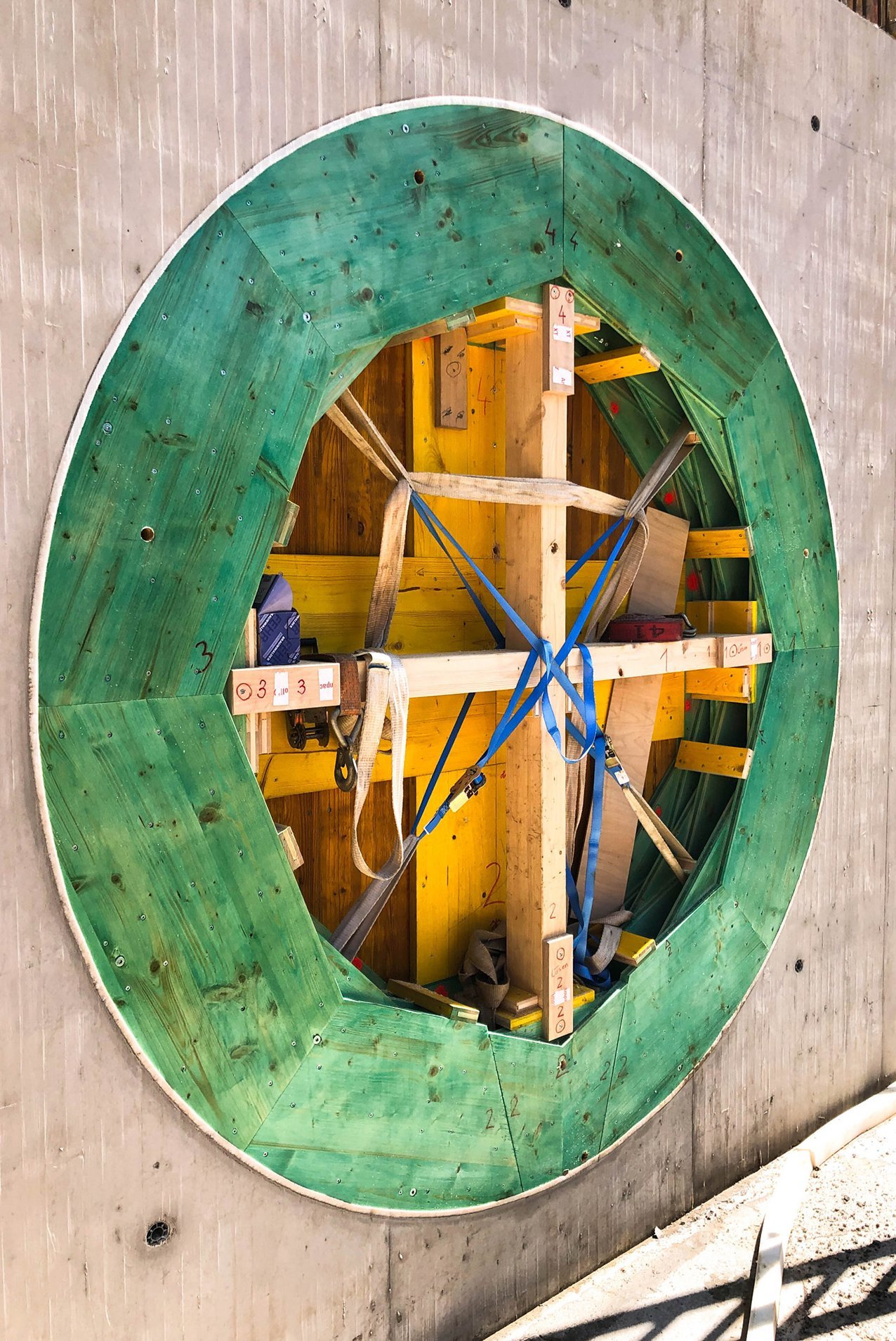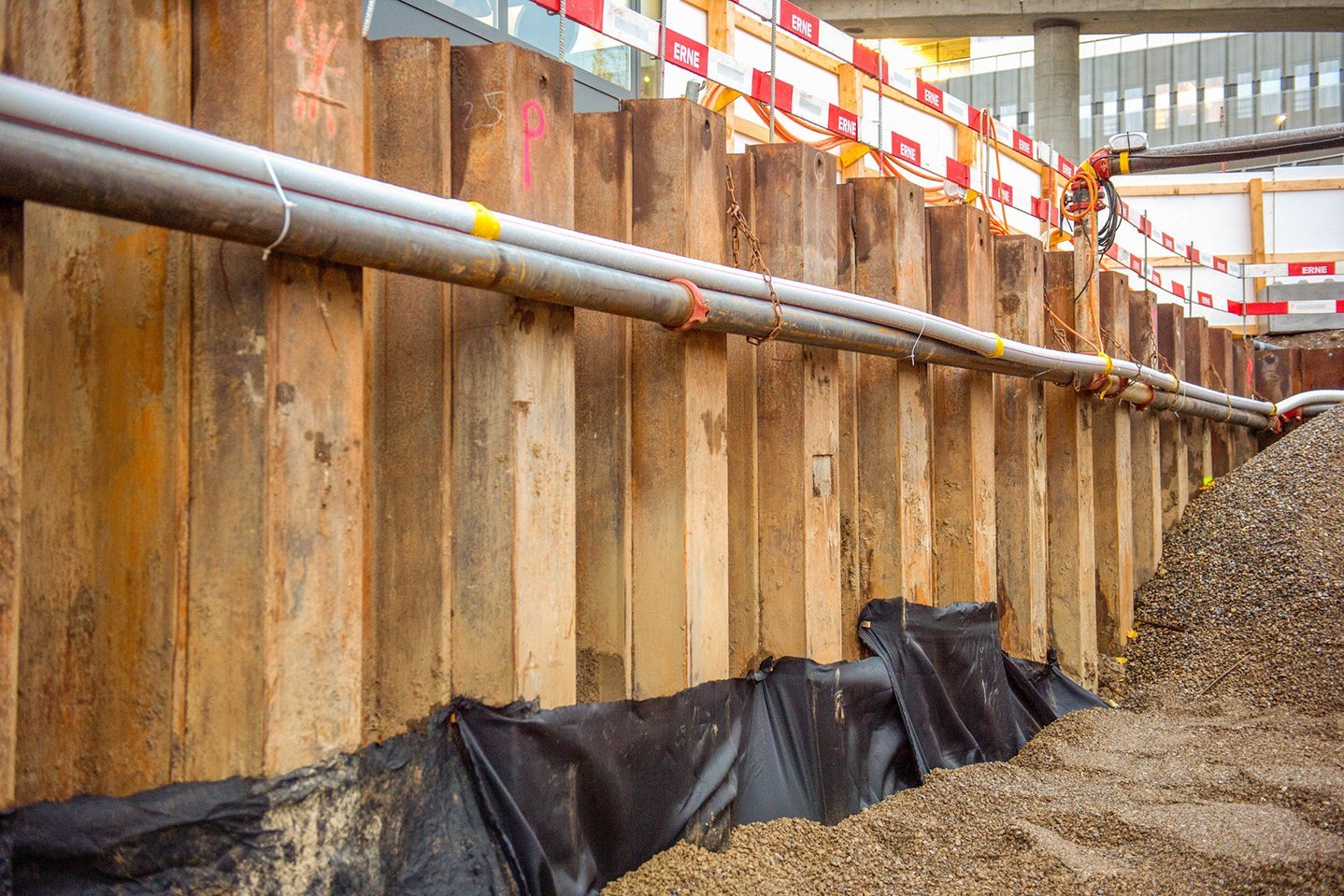 Für die Baugrube hat das Tiefbau-Team 14'065m³ Aushubmaterial abgegraben. Der kiesige Aushub wurde abgesiebt und für den Materialaustausch des Bodens wiederverwendet. Die Grube wurde so ressourcenschonend ausgeglichen. Die Baugrubensicherung und Abdichtung erfolgte mittels Spundwänden. Der Grundwasserspiegel wurde mit Filterbrunnen abgesenkt und das anfallende Wasser wieder der Limmat zugeführt. Die Baugrubensohle welche die Basis für das spätere Bauwerk bildet wurde durch die Wasserhaltungsmassnahmen vor Auflockerung und Durchnässung geschützt. Nach Fertigstellung des Bauwerks werden die Massnahmen zur Grundwasserabsenkung wieder deinstalliert.