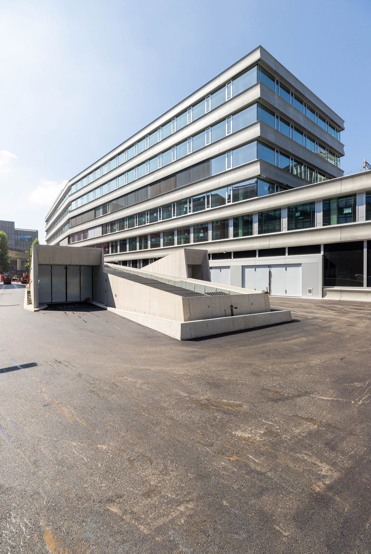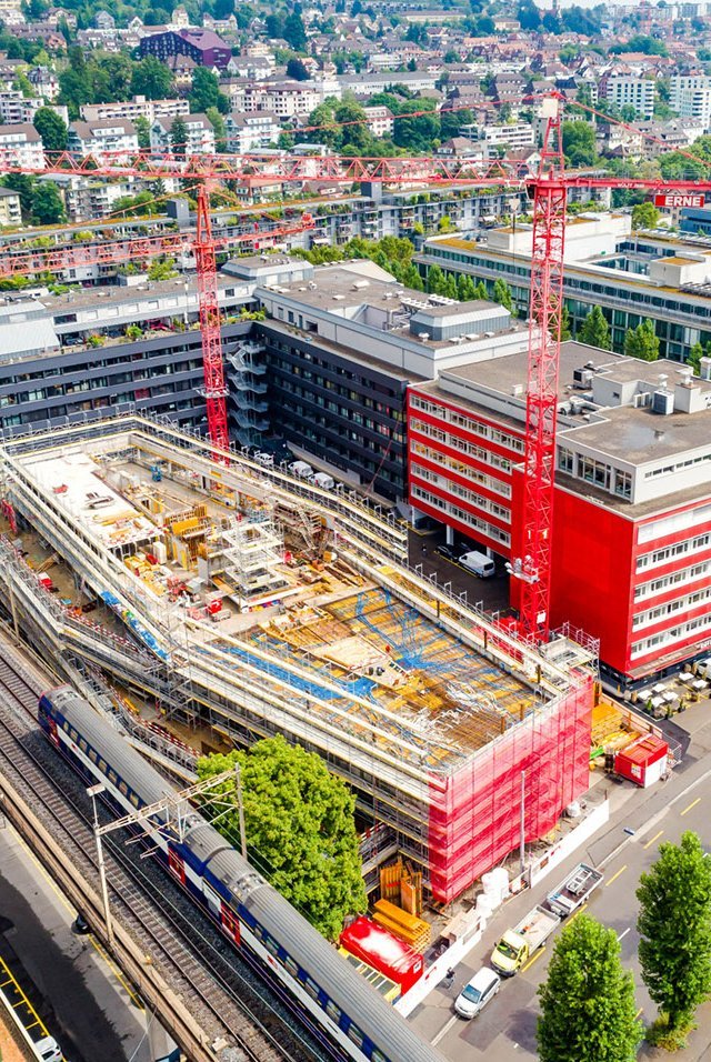 Mitten in der Stadt Zürich, angrenzend an benachbarte Geschäftshäuser, stark befahrene Strassen und ein Bahnviadukt, war der zur Verfügung stehende Platz für den Bau beschränkt. Die Abläufe auf der Baustelle mussten optimal geplant und durchgeführt werden. Als Abladestelle und Umschlagplatz für Materialien und Maschinen diente die bereits erstellte Einfahrt zur Tiefgarage. Nicht nur logistische Prozesse mussten gut funktionieren, auch der Einsatz von Kränen musste auf dieser Hochbau-Baustelle exakt abgestimmt werden. Das Bahnviadukt verläuft neben dem Neubau in Höhe des dritten/vierten Obergeschosses. Im Abstand von wenigen Minuten passieren Züge die Strecke. Die beiden Baukräne waren mit einer 3-D-Steuerung ausgerüstet und führten automatisch Messungen durch, wie nahe sich Ausleger und Material an den Fahrleitungen befanden. Wenn zu nahe an die Bahnlinie heranmanövriert wurde, stoppte der Kran automatisch. Das Sicherheitskonzept gewährleistete den Schutz der vorbeifahrenden Züge und wurde vor Beginn der Bauarbeiten von der SBB genehmigt.