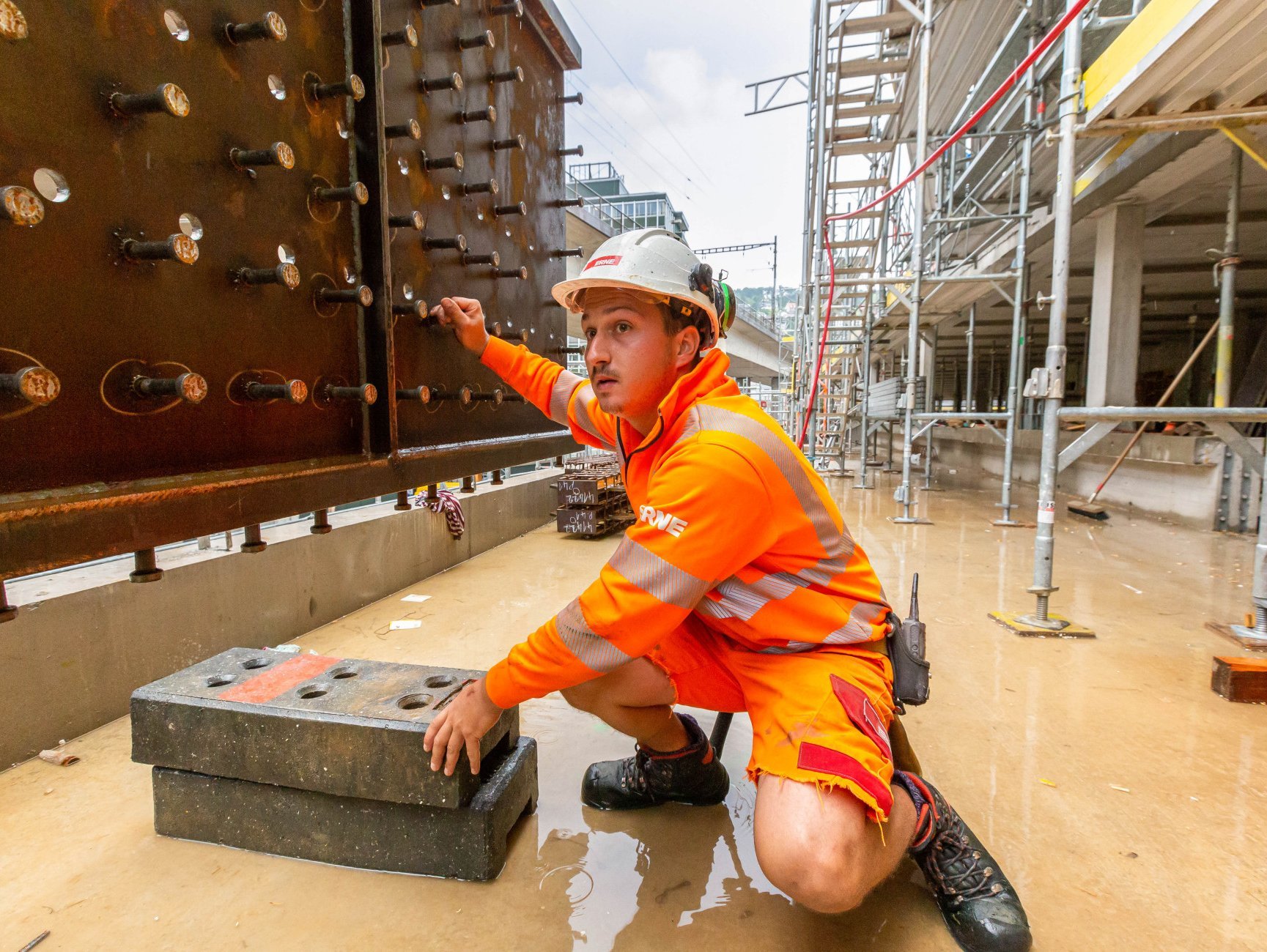 Nebst Schallentkoppelungsmassnahmen und Stahlträgern sollte der Bauprozess optimiert werden, um Zeit einzusparen und die Bauarbeiten zügig voranzutreiben. Projektleiter, Bauführer und Poliere des ERNE Hochbau-Teams entwickelten deshalb einen passenden Prozess, bei dem die Aussenwandkonstruktion vorgezogen wurde und die Decken mit Schraubarmierung dazwischengehängt wurden. Damit konnte für die Decken auf Abschalungen verzichtet werden. Bei einer Aussenwandlänge von rund 200 Metern pro Etage hat sich diese Optimierung gelohnt.
