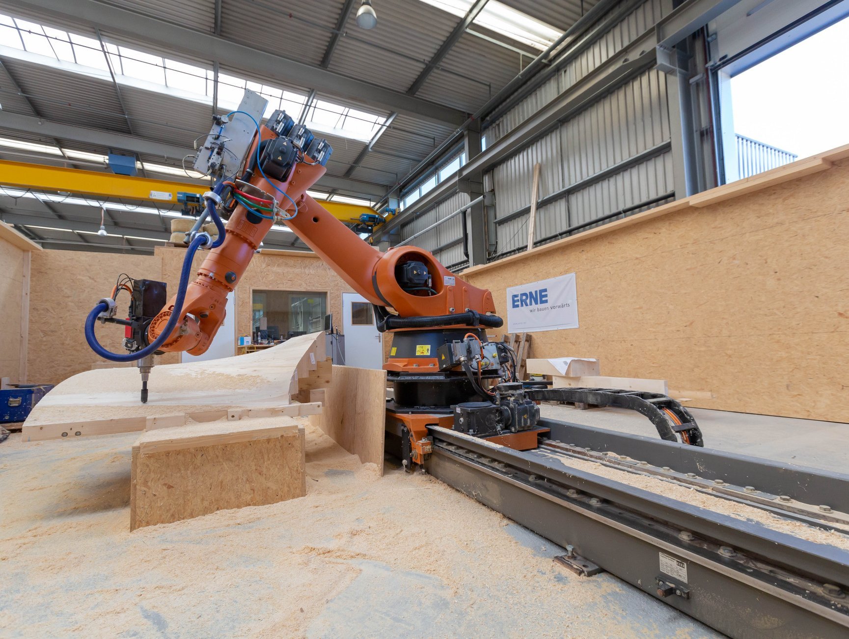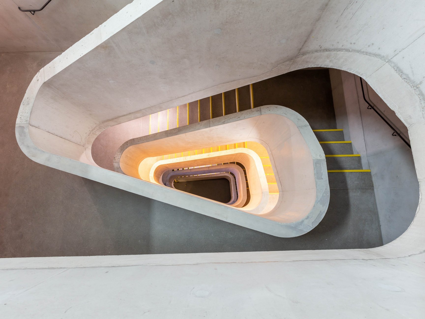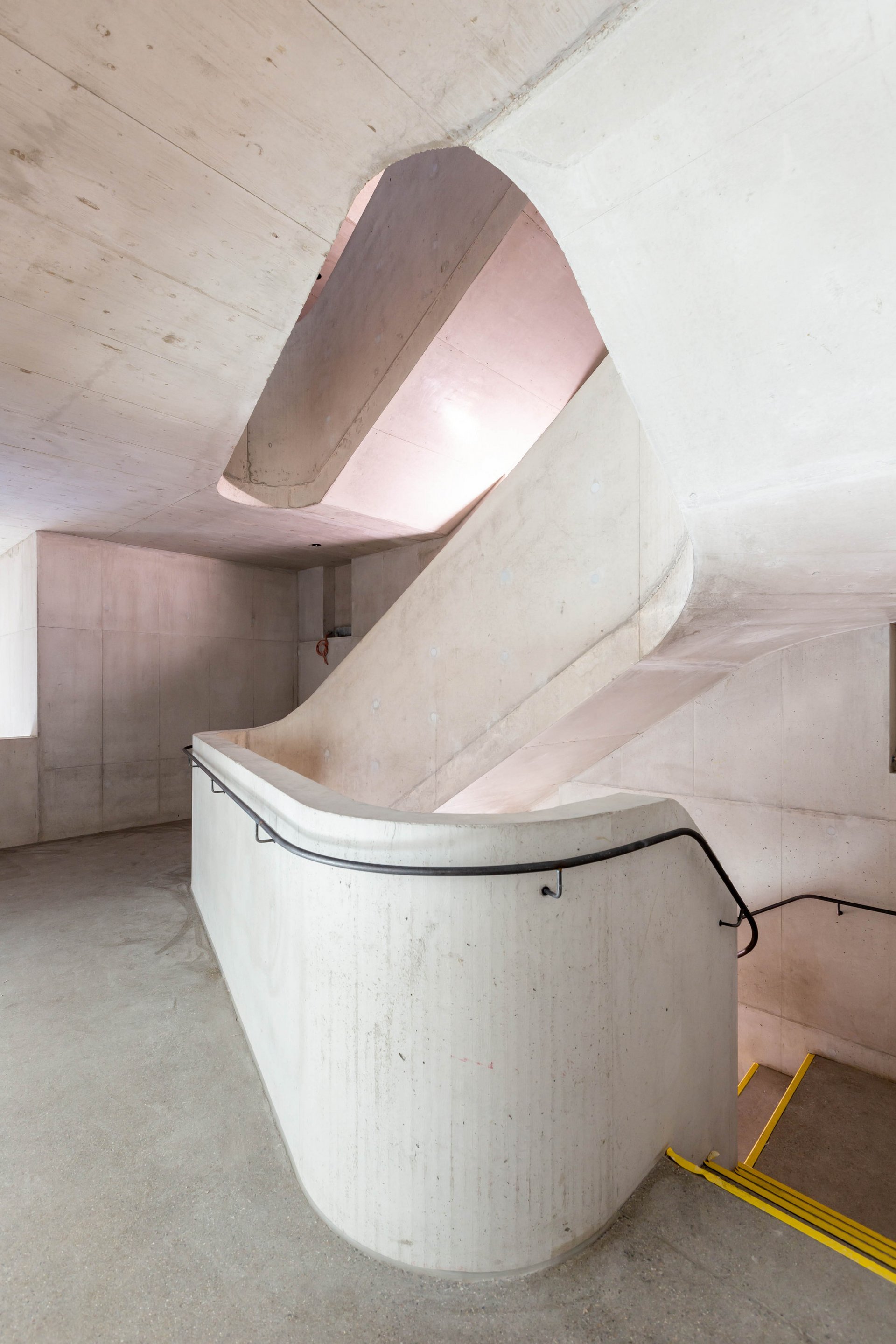 Damit die Treppenhäuser ins neue Konzept passen, brach man zu Beginn auf der einen Seite die bestehende Treppe und auf der anderen Seite die bestehenden Betonlaufstege und Trichteröffnungen komplett ab. Präzise Schnitte mit der Diamantsäge in die flankierenden Aussenwände und Betondecken, ausgeführt vom ERNE Team Bohren und Trennen, ermöglichten die Ausführung der Abbrucharbeiten mit einem Roboter. Für den Neubau der Sichtbeton-Treppen waren aufwändige Schalungselemente notwendig. Diese wurden bei der ERNE AG Holzbau in Stein gefertigt, teilweise mit dem Portalroboter. Durch die Verwendung von fertigen Spezialschalungen konnte auf der Baustelle speditiver gearbeitet werden. Das Schalen und Betonieren innerhalb der bestehenden Strukturen bot aufgrund der engen Platzverhältnisse auch so noch genügend Herausforderungen.