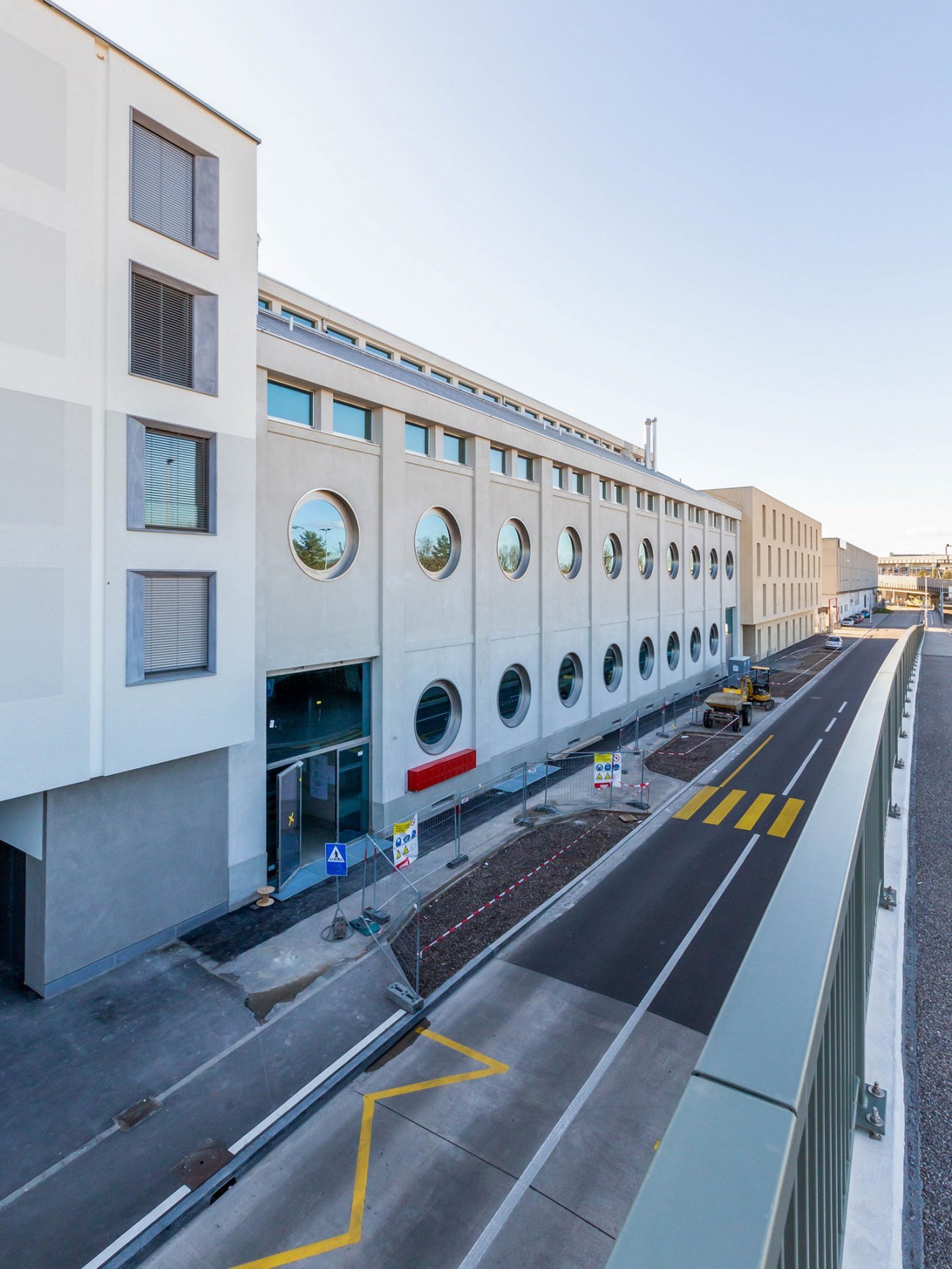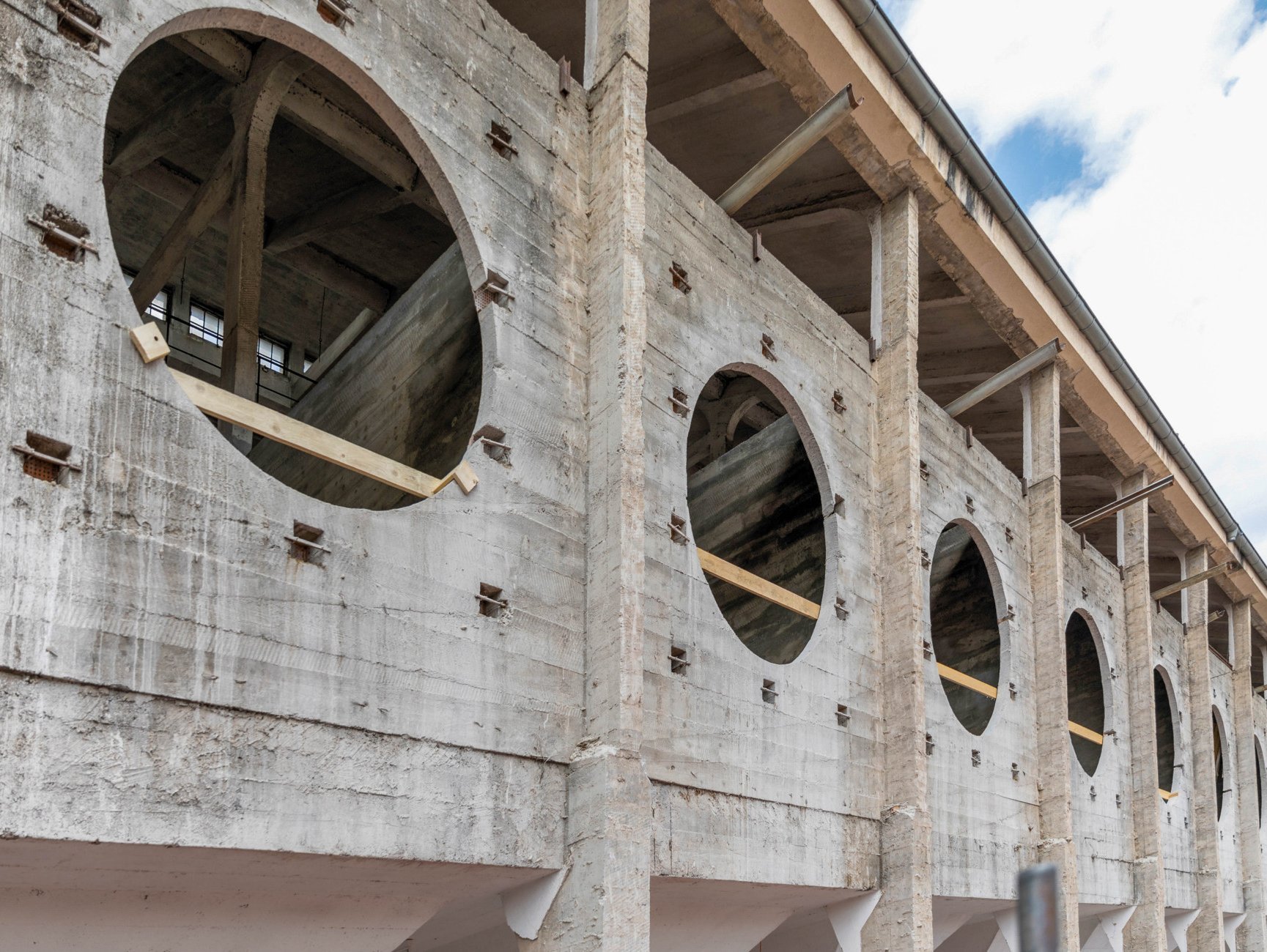 Aus dem Beton des historischen Silogebäudes wurden 20 grosse, kreisrunde Öffnungen mit 260 cm Durchmesser herausgeschnitten. Das ERNE Team Bohren/Trennen setzte dafür eine spezielle Seilsäge ein. Besonders herausfordernd waren die Schneidearbeiten bei starkem Wind. Es durfte kein Betonnebel auf die angrenzende Autobahn gelangen, deshalb mussten entsprechende Vorkehrungen getroffen werden. Da keine weitere Bearbeitung der Schnittkanten geplant war – um den Industriecharakter des Gebäudes zu erhalten – mussten die Arbeiten besonders präzise ausgeführt werden. Die neuen Öffnungen wurden später mit runden, vorfabrizierten Fensterelementen geschlossen. Diese bringen nun Licht ins neu gestaltete Gebäude und schaffen ein schönes Ambiente.