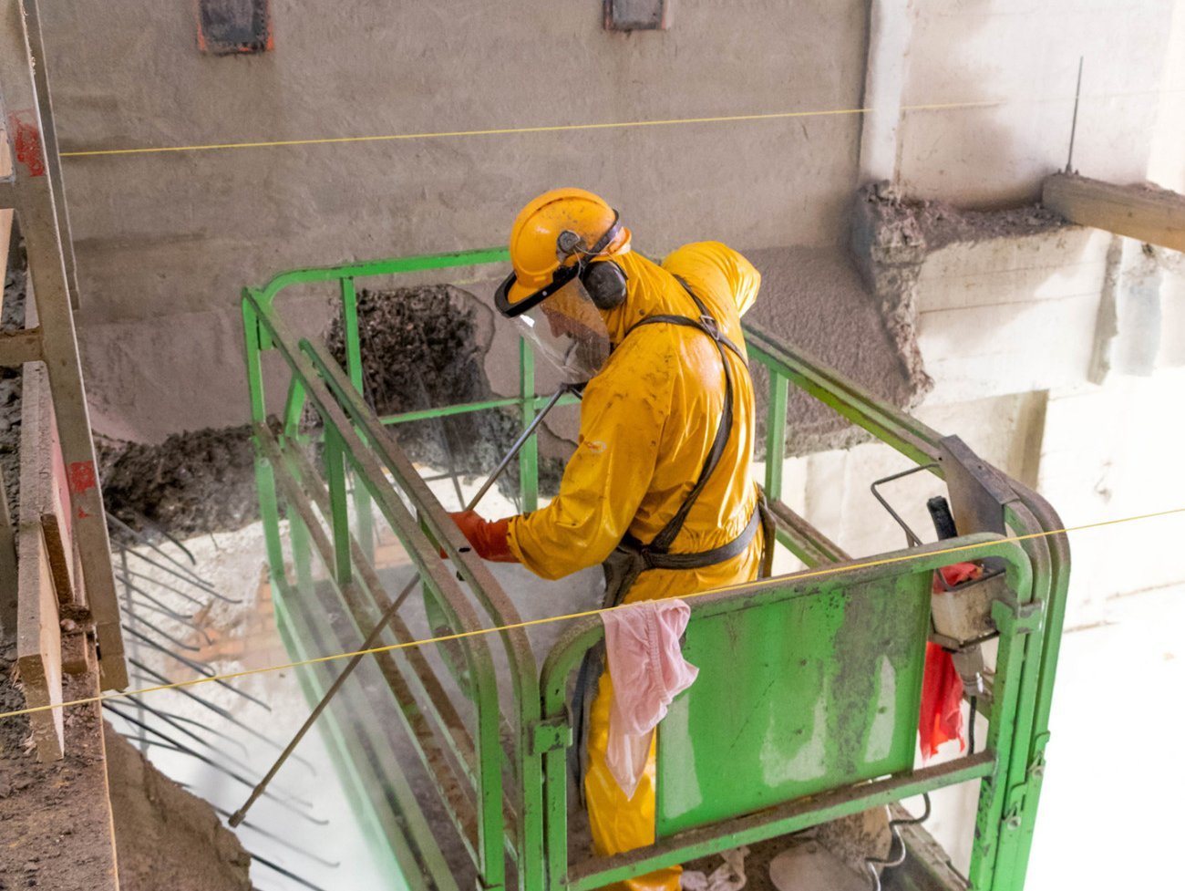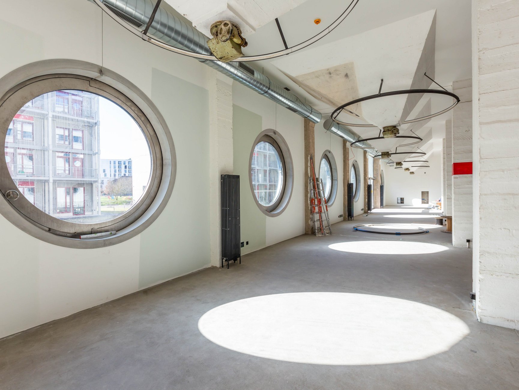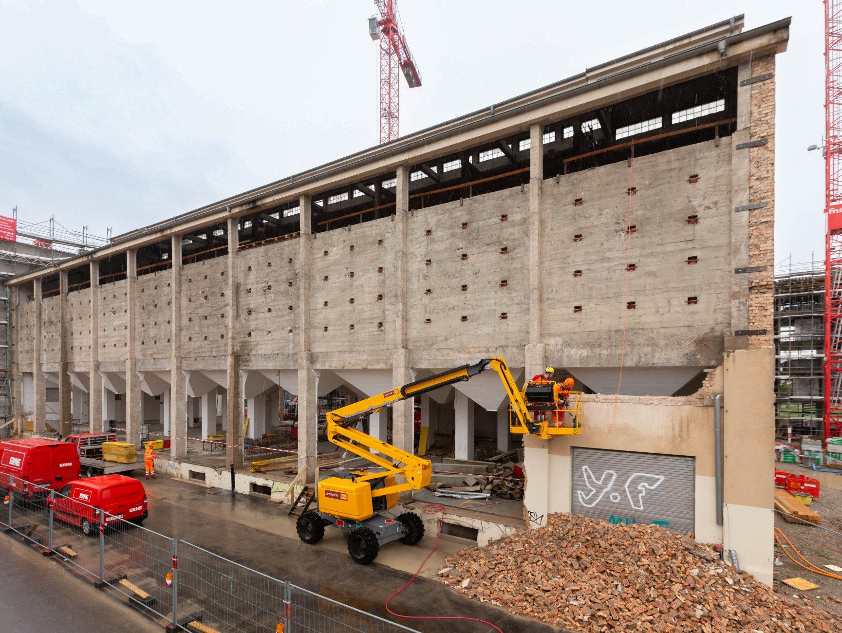Zur Verstärkung und optischen Verschönerung der bestehenden Aussenfassade wurde im Inneren ein Porenbeton-Mauerwerk mit Pfeilern und Lisenen in verschiedenen Mauerstärken angebaut. Im Obergeschoss wurden Sichtbetondecken errichtet und die meisten Trichterlöcher der ehemaligen Kaffee- und Getreidesilos mit Dämmschüttung aufgefüllt und mit Beton verschlossen, um zusätzlichen Platz zu schaffen für die spätere Nutzung. Einige der Trichter bleiben offen und sichtbar, sodass die Möglichkeit besteht, auch nach dem Umbau einen Blick in die ehemaligen Lagerstätten werfen zu können. Das Ober- und Dachgeschoss wurde zudem mit Akustik-Mauerwerken ausgestattet, um eine angenehme Atmosphäre zu schaffen. Bei allen Betonanschlussflächen im Innern des Gebäudes, wo bestehende Bauteile mit neuen verbunden wurden, kam die ERNE decon mit der Dienstleistung «Surface» zum Einsatz. Die Betonoberflächen wurden aufgeraut und die Bewehrung für die folgenden Arbeiten freigelegt.