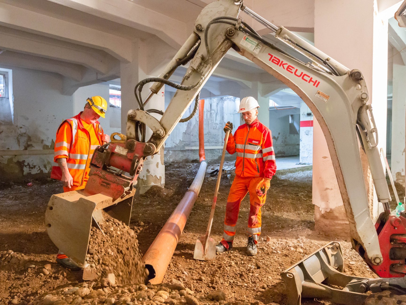 Den Start bildete der Abbruch der Bodenplatte im Keller. Wegen der geringen Raumhöhe konnte der Fundamentaushub zur Absenkung der Bodenplatte nur mit kleinen Baggern erfolgen. Da die engen Platzverhältnisse ein rasches abführen des Aushubmaterials erforderten, kam der ERNEFANT-Saugbagger zum Einsatz. Zur Baugrundstabilisierung setze man anschliessend Mikropfähle ein. Danach wurde die neue Bodenplatte aus Ortbeton mit integriertem Lüftungskanal eingebaut.
