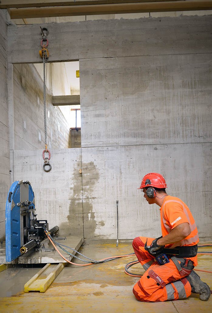 Für die Zugänge im Inneren des Gebäudes zu den zukünftigen Zimmern musste in die bestehende Trichterwände Türöffnungen mit der Wandfräse geschnitten werden. Die Herausforderung waren auch hier die Schnittkanten, da die neuen Türöffnungen sichtbar bleiben und nicht durch Zargen verdeckt werden.