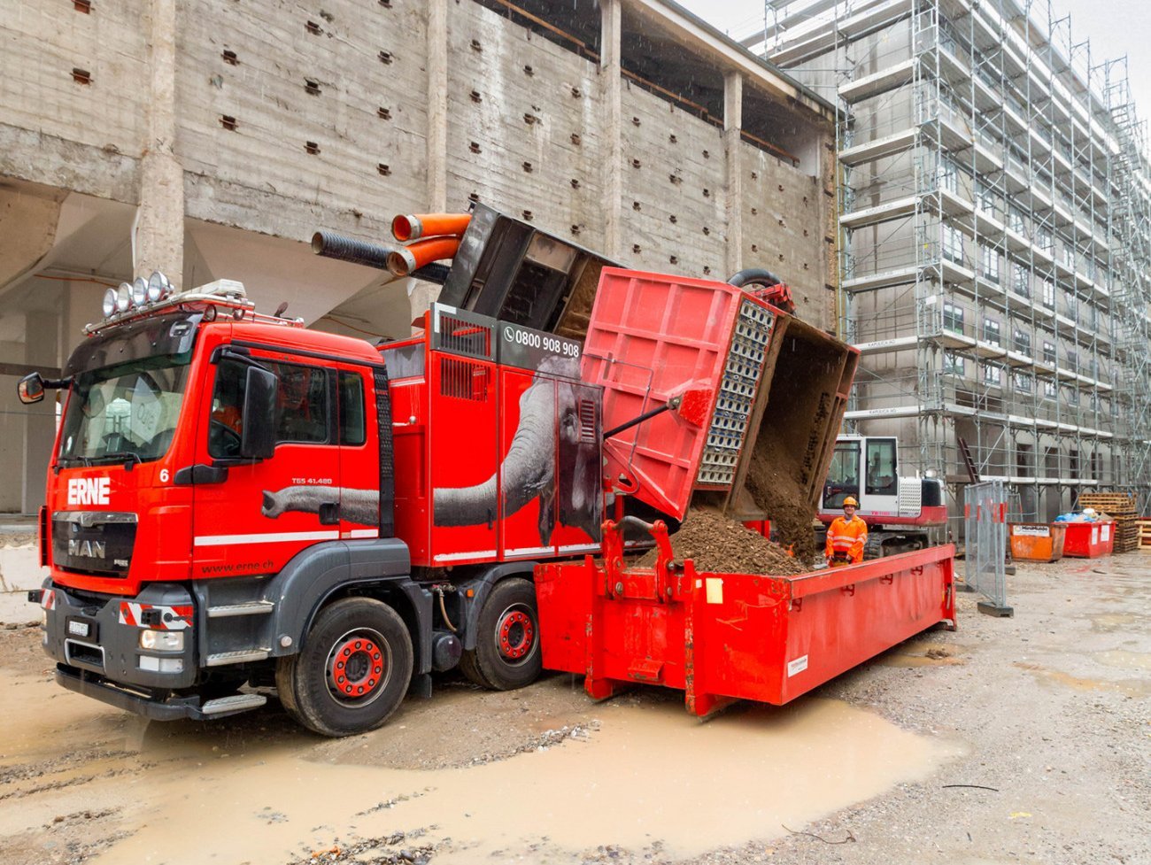 Die Sanierung des alten Silo-Gebäudes im Erlenmatt Quartier bot vielfältige Herausforderungen. Das Gebäude, welches früher als Lager für Getreide und Kakao diente, wurde umgebaut und wird nach der Eröffnung im Sommer 2020 für Gastronomie und Gewerbe genutzt werden. Bei den Arbeiten war das breite Leistungsspektrum von ERNE im Bereich Umbau/Sanierung gefragt. Für die Entfernung des Inventars kam die Sparte Entkernung zum Zug und zum Absaugen des Aushubmaterials ein Saugbagger. Um Licht in die künftigen Räume zu bringen realisierte das Bohren und Trennen-Team kreisrunde Fensteröffnungen in den Wänden des Silos. Für die ästhetischen Sichtbeton-Treppenhäuser wurden Spezialschalungen in Zusammenarbeit mit der ERNE AG Holzbau angefertigt.