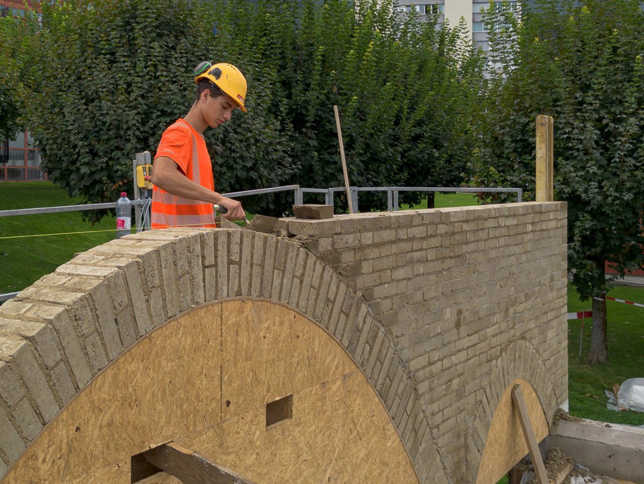 Der Pavillon MANAL ist ein Proof of Concept, der Nachhaltigkeit und Kreislaufwirtschaft verbindet. Ein zentrales Element des Projekts ist der Einsatz innovativer, zementfreier Baustoffe, die auf der Technologie von Oxara basieren. Für die Bögen und Gewölbe verarbeitete unser Team Oxabloc, zementfreie Lehmsteine, sowie erstmals ausserhalb des Labors einen Erdmörtel, der auf der Oxara-Technologie Oxabrick® Loko basiert.