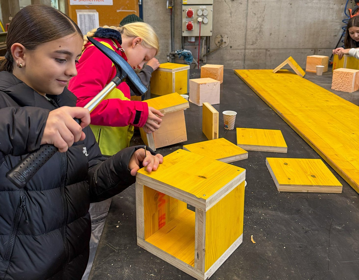 Nach einem spielerischen Einstieg gingen die Kinder direkt an die Arbeit. Unter Anleitung unseres Fachpersonals bauten sie ihr eigenes «Bhaltis». Sie setzten Schalplatten zu einer kleinen Box zusammen, besprühten sie mit Farbe und isolierten diese mit Silikon.