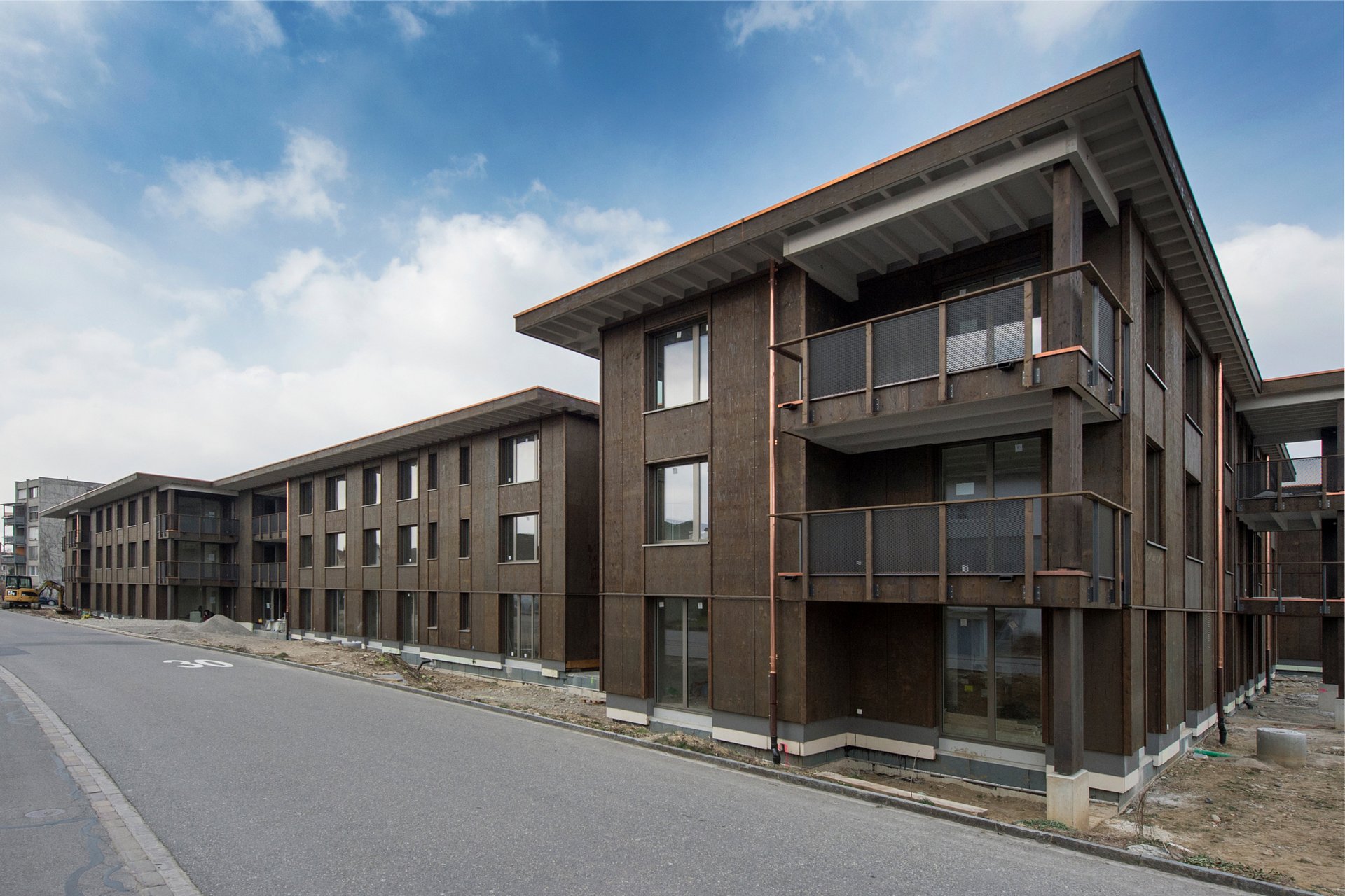 Neubau einer Wohnsiedlung in Holzmodul-Bauweise sowie einer Autoeinstellhalle.