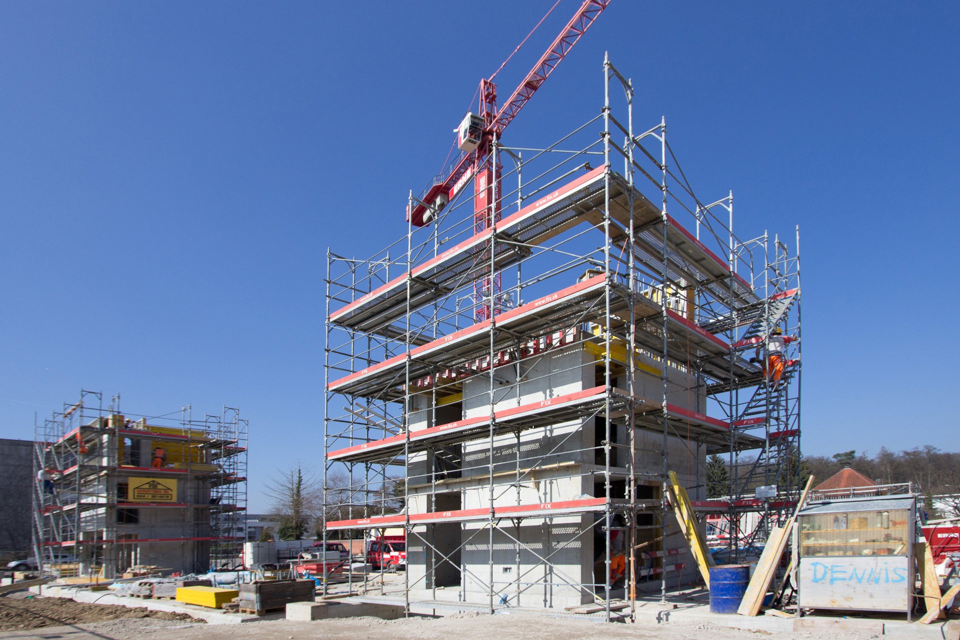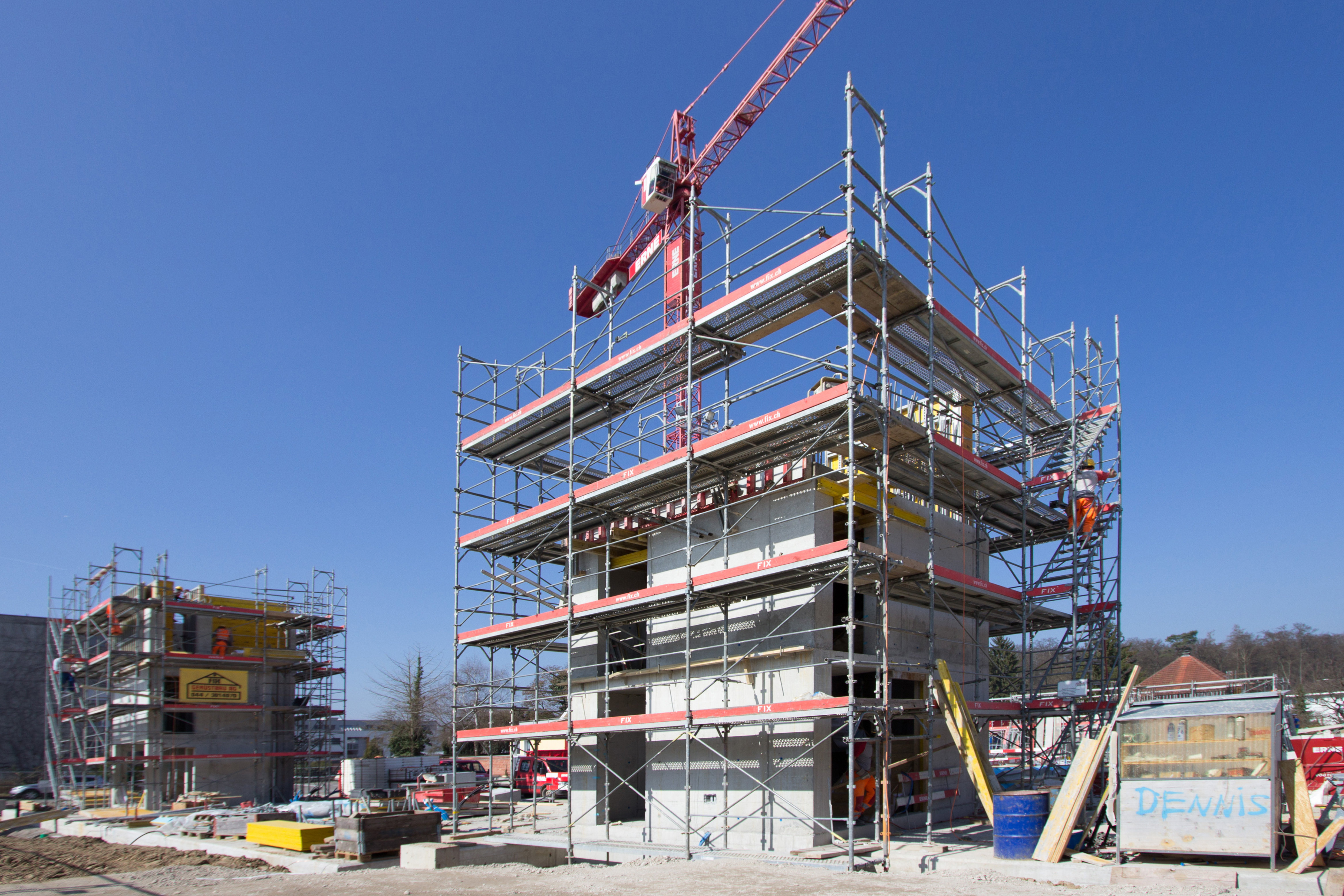 Neubau einer Autoeinstellhalle, des Untergeschosses und der Kernzonen in Ortbeton. Bodenplatte in Monobeton ausgeführt. Treppenhäuser in Sichtbeton Schalungs-Typ 4.1. Der anschliessende Bau der Wohnsiedlung in Holzmodul-Bauweise erfolgte bauseits.