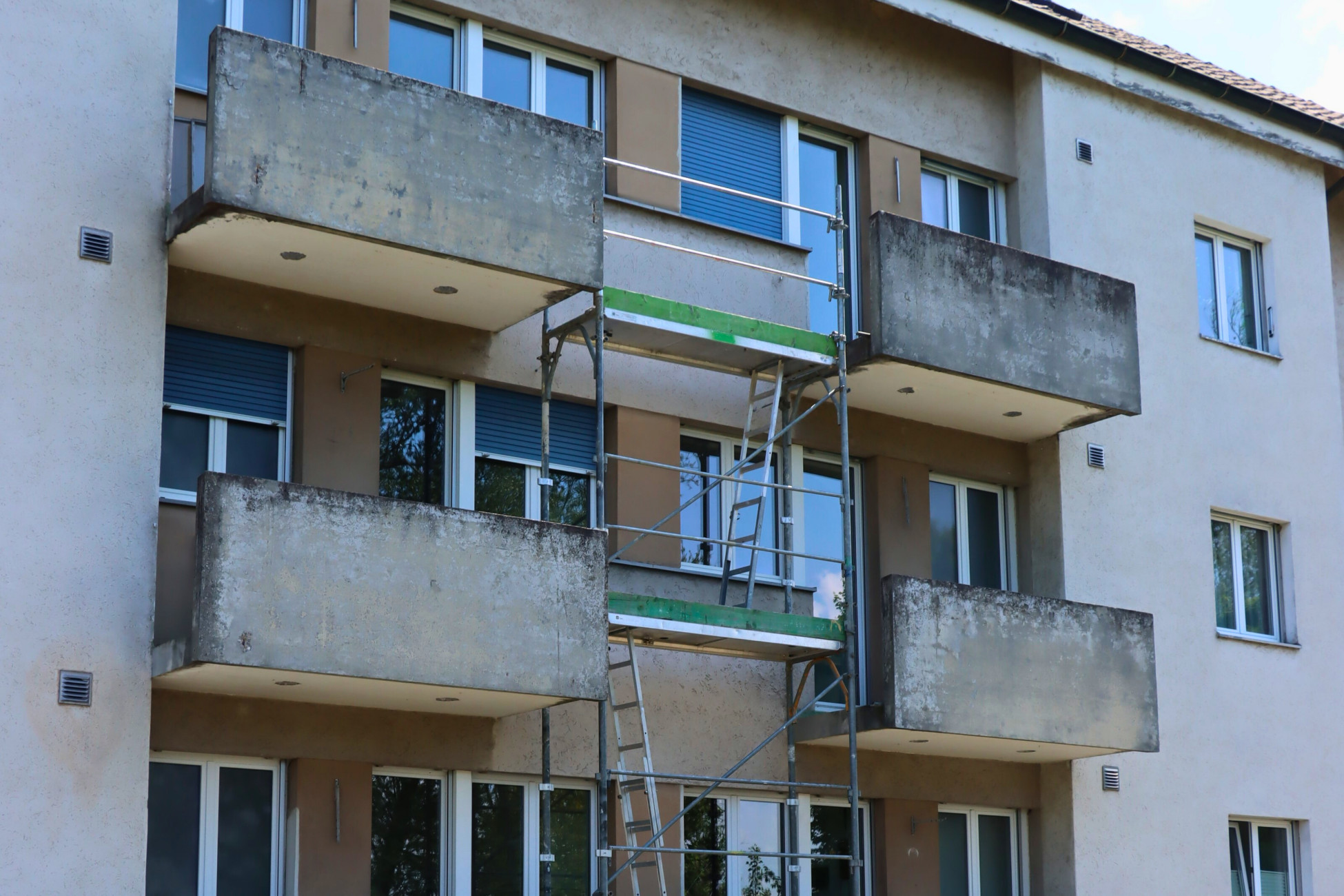 Für den späteren Neubau der Balkone wurden insgesamt 48 Balkone abgeschnitten und mit dem Teleskoplader sowie dem LKW-Kran abgebaut. Bei allen Etappen wurden die Kernbohrungen für die neuen Balkonstoren erstellt. Grosse logistische Herausforderung infolge engen Platzverhältnissen. Die Wohnungen waren während der Arbeitsausführung bewohnt.