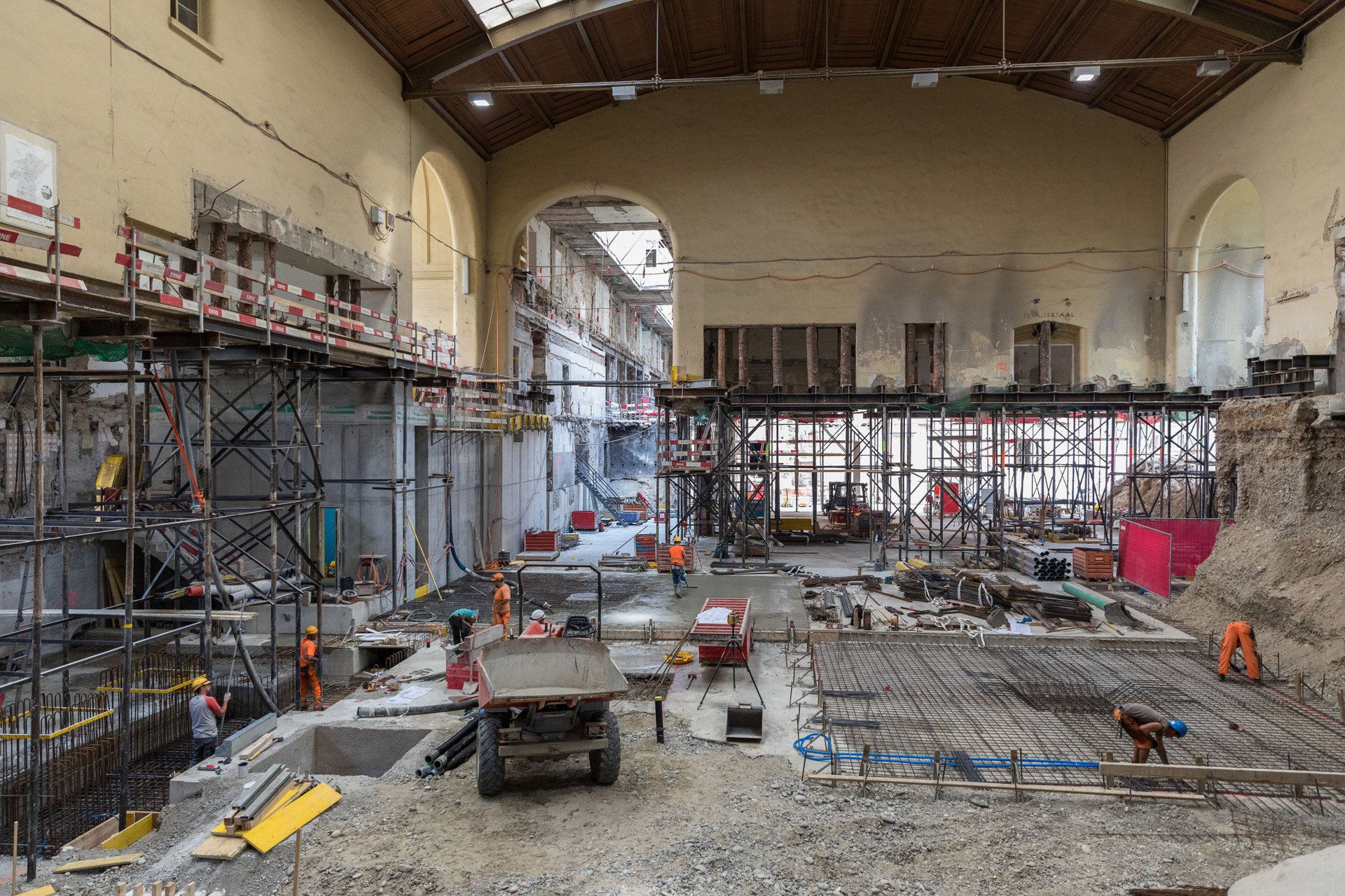 Die Abbrucharbeiten im Bahnhof SBB Westflügel schreiten weiter voran und die ersten funktionalen Baubereiche wie Treppenhäuser sind bereits erstellt. Die denkmalgeschützten Aussenmauern werden derzeit mit 16 Meter hohen Mikropfählen (Stahlstützen) abgefangen; diese halten das Gebäude ohne Fundament aufrecht. Im Boden, 10 Meter tief verankert, geben sie der Gebäudehülle genügend Stabilität, um weitere darunterliegende Baumassnahmen in Angriff zu nehmen. Mit dieser aufwändigen Vorkehrung wird Platz gewonnen, damit das neue Untergeschoss und die Anbindung der alten Personenunterführung PU-Gundeli gebaut werden können. Bodenaushub und Abbruchmaterial sind nur unter erschwerten Bedingungen transportierbar. Die bestehenden alten Mauern mit den Rundbögen bieten nach wie vor die statische Tragstruktur. Nach dem Rückbau von Zwischenwänden kamen weitere Rundbögen zum Vorschein, die sich in das neue Erscheinungsbild homogen einfügen werden. Die engen Platzverhältnisse und die Tatsache, dass der Abtransport der Materialien nicht von oben erfolgen kann, sondern mit Baggern, setzt eine logistische Meisterleistung voraus. Das 30-köpfige ERNE Team stellt sich täglich den neuen Herausforderungen und erweitert mit den erarbeiteten Lösungen seine Erfahrungen.