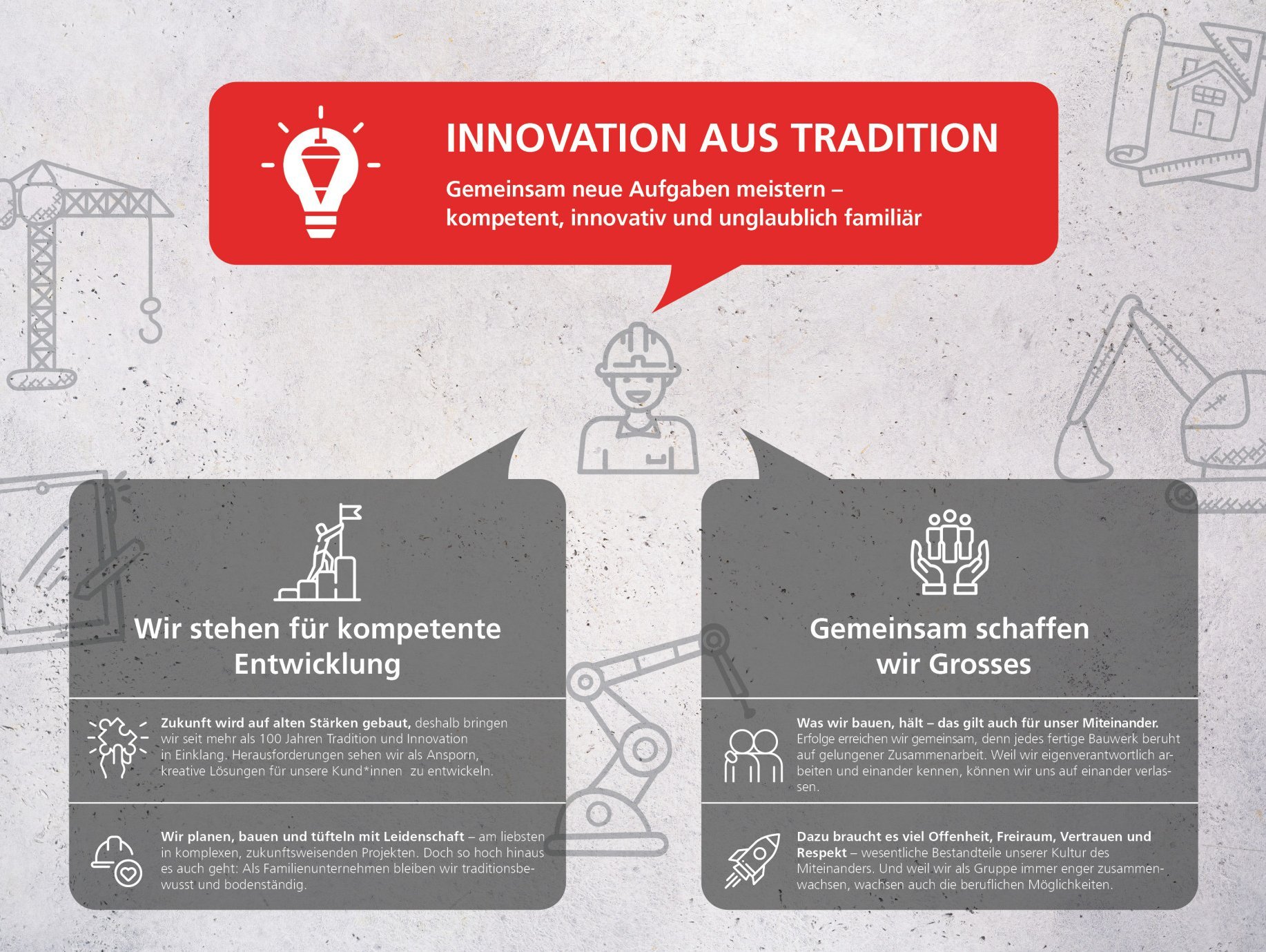 At ERNE AG Bauunternehmung, we have doer qualities and a great passion for construction. With our customer-oriented approach, we realize successful building construction, civil engineering and conversion projects of all types and sizes. We maintain a lively exchange with our customers and partners and keep our finger on the pulse of the times. With the fourth generation of the Erne family at the helm and over 100 years of experience, we stand for stability, cohesion and appreciation. Join our team, we want to "build the future" together with you.