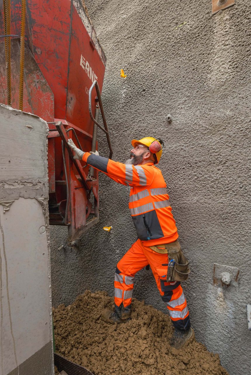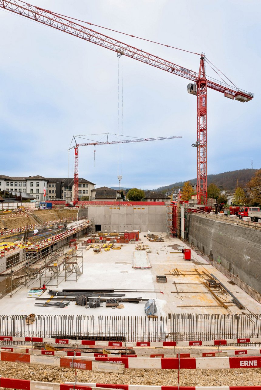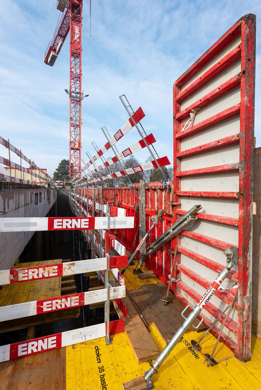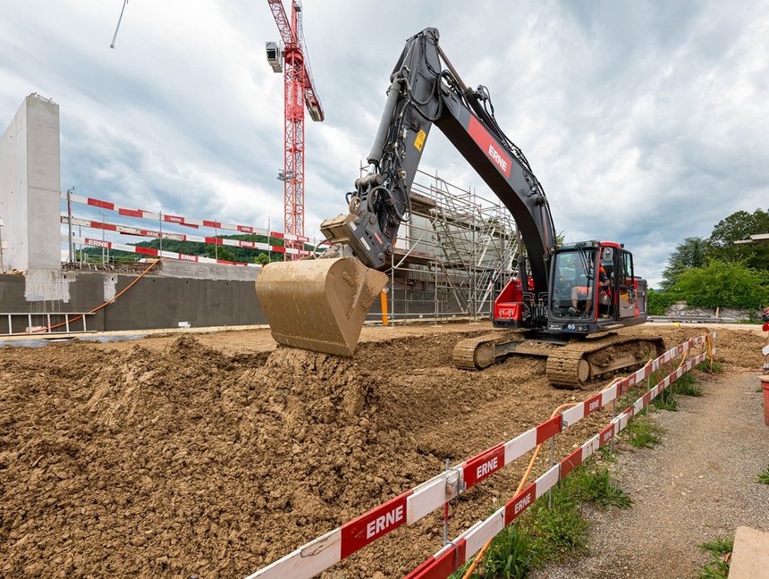 Auf der Baustelle werden die digitalen Daten unmittelbar in die Ausführung integriert. Die Bagger für die Aushubarbeiten waren mit einem Tablet im Führerstand ausgestattet, wodurch der Fahrer mittels Positionsdaten von Satelliten die exakte Position der Schaufel sah. Alle Werte wie auch das Aushubvolumen von 21'000 Kubikmeter sind für alle Projektbeteiligten jederzeit verfügbar. Die neun Meter tiefe Baugrube wurde mit Spezialtiefbaumassnahmen wie Nagelwänden und Spritzbeton gesichert.