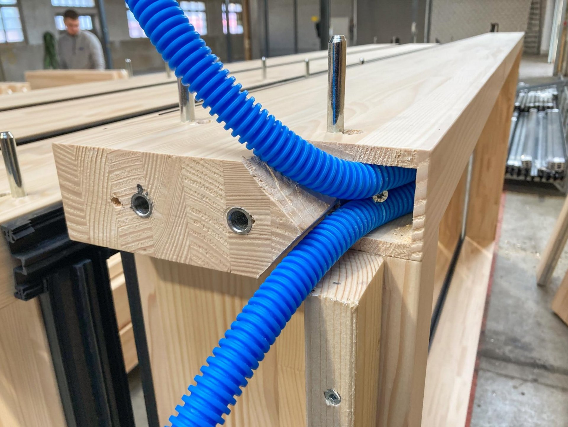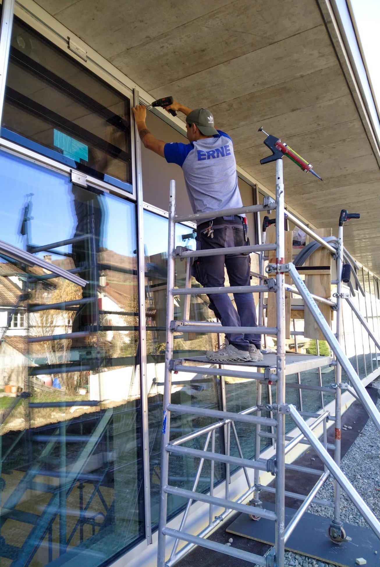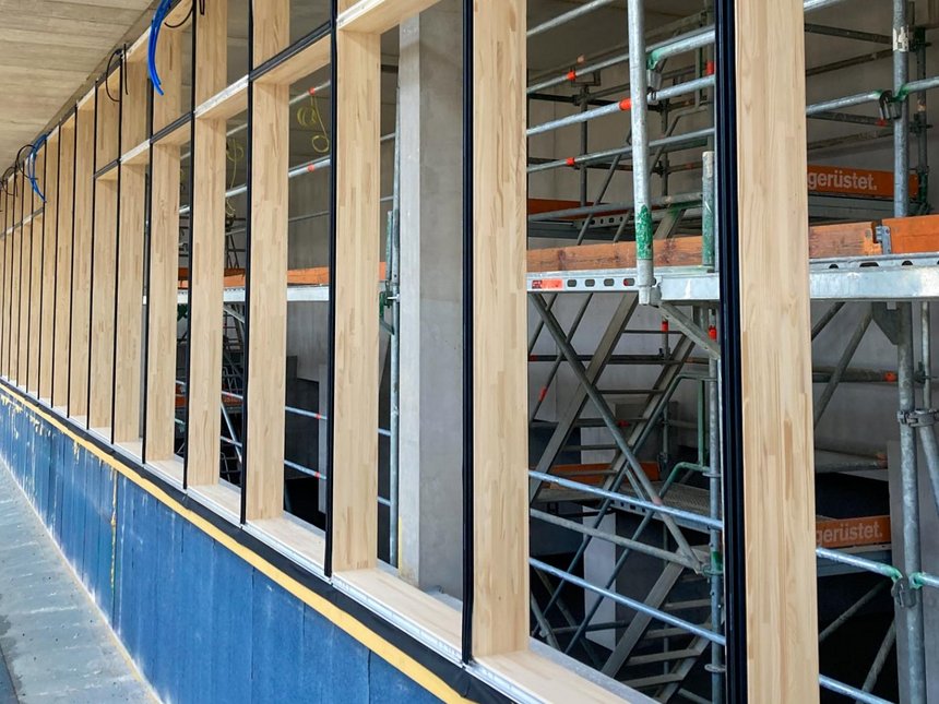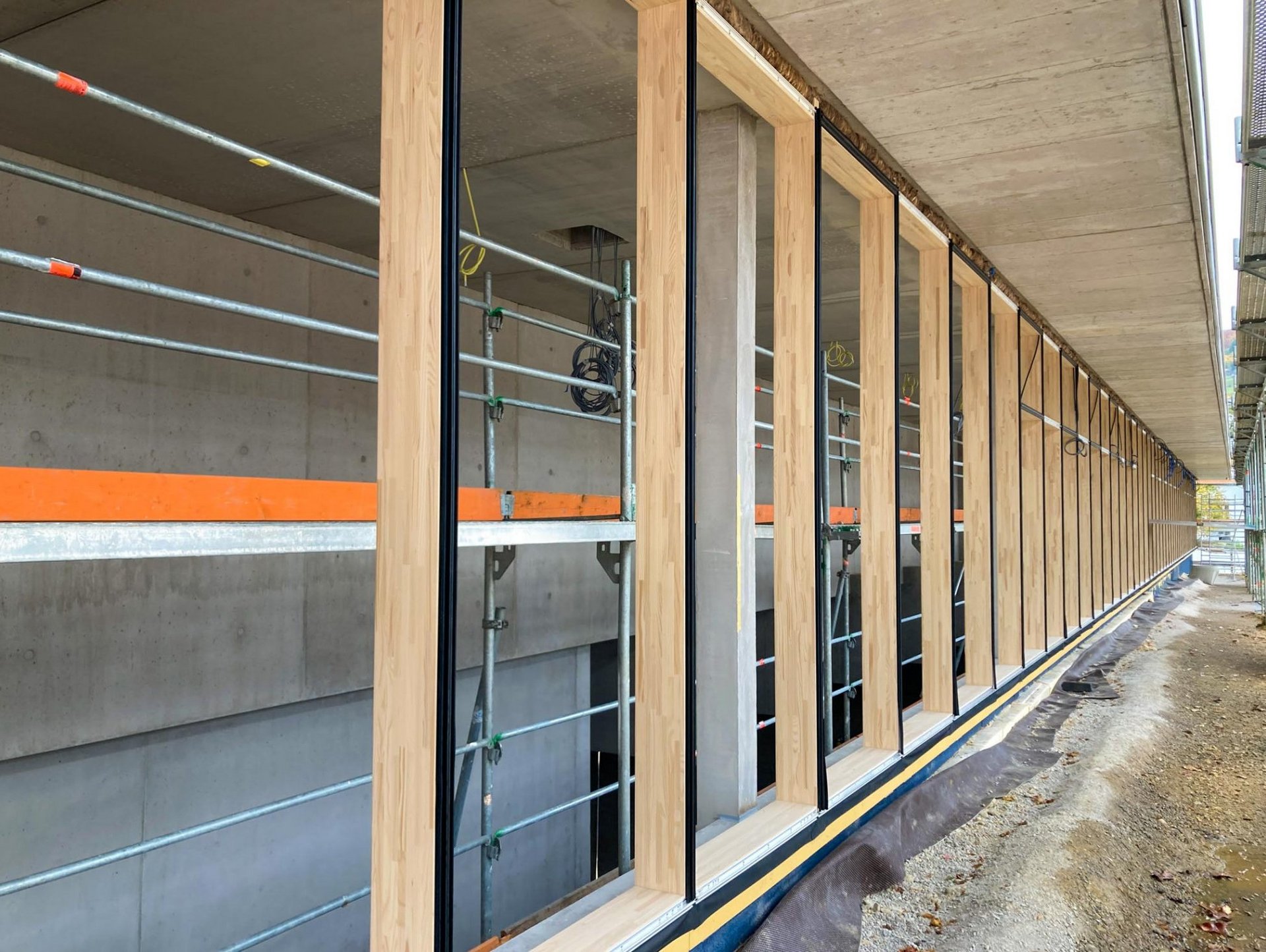 Die Fassadenplanung erfolgte zweistufig: Aus der 2D-Grundplanung entstand eine 3D-Fertigungsplanung für die maschinelle Produktion, wodurch die Elemente in der Produktion von ERNE AG Holzbau in Stein präzise gefertigt werden konnten. Auf der Baustelle setzten die erfahrenen Holzbaumonteure die Pfosten-Riegel-Fassade ein und integrierte die Fenster passgenau, wodurch die Fassade in Qualität und Ausführung exakt den architektonischen Vorgaben entspricht.