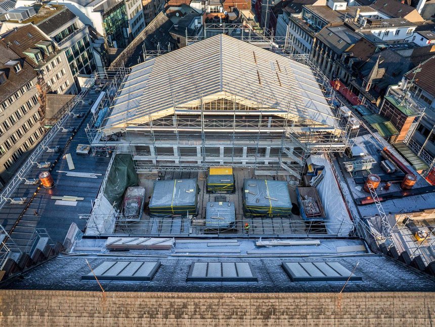 Komplexe Details stecken in der Ausführung, denn die filigranen Bauteile verlangen den Handwerkern höchste Präzision und Fingerspitzengefühl ab. Die imposanten Raumdimensionen rufen nach hohen Decken und Wänden, doch die aktuell grösste Herausforderung ist der Anschluss der neuen Decken an den alten Baubestand. «Es braucht viel Vorarbeit, denn das Gebäude muss ja möglichst lange gedeckt bleiben», erklärt Egli. Wichtige Meilensteine wurden bereits erreicht, darunter der Abschluss der Baumeisterarbeiten auf der Seite Gerbergasse sowie die Fertigstellung der Patiobodenplatte mit sämtlichen Medienkanälen. In Spitzenzeiten waren bis zu 35 Mitarbeitende gleichzeitig im Einsatz, aktuell sind es etwa 20.